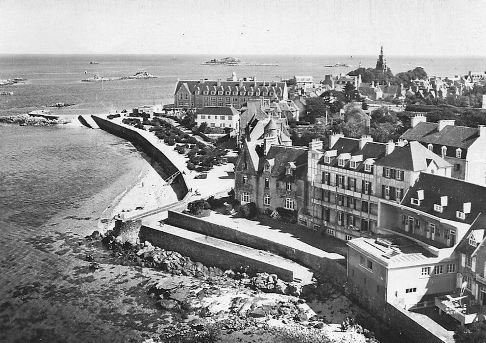 Vue aérienne oblique de la Villa Kerléna et des demeures voisines, carte postale. Au centre de la photographie, à gauche, le mur de soutènement surmonté d'un crénelageImmatriculation
