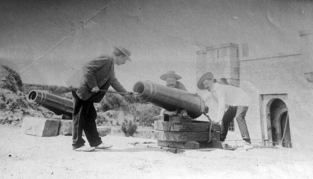 Vue du corps de garde crénelé vers 1895 avec deux pièces d'artillerie (source : collection particulière publiée par Pierre-Yves Decosse en 2015). Monsieur Delaselle, Monsieur Masson et une troisième personne simulent l’utilisation des canons...Immatriculation