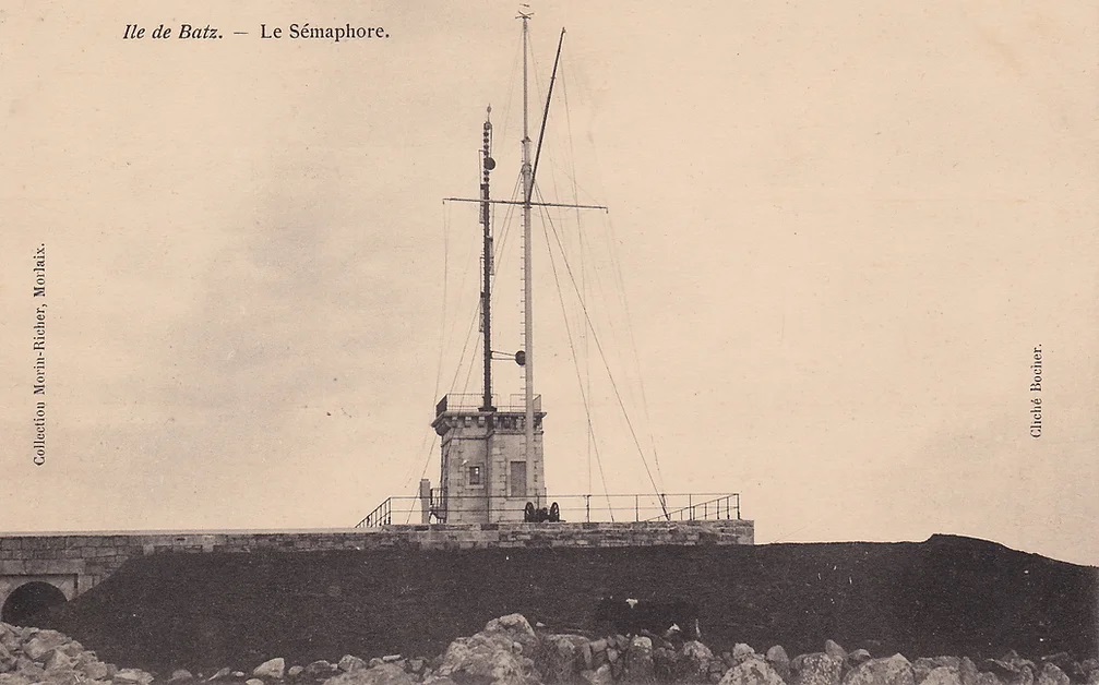 Vue de la caserne et du sémaphore, carte postale (cliché Bocher ; collection Morin-Richer Morlaix). On distingue, le mât du système Depillon sur la tour et le mât de pavillon avec à ses pieds un canon d'alarme ; parapet et bretèches de la caserne sont arasésImmatriculation