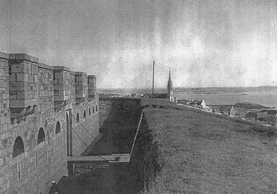 Vue de l'élévation Sud-ouest de la caserne : entrée et pont-levis (source : Le sémaphore sur GladEnez, association de mise en valeur du patrimoine de l'île de Batz). Cette photographie est antérieure à 1905 : parapet et bretèches sont en place. En arrière-plan, l'église paroissiale Notre-DameImmatriculation