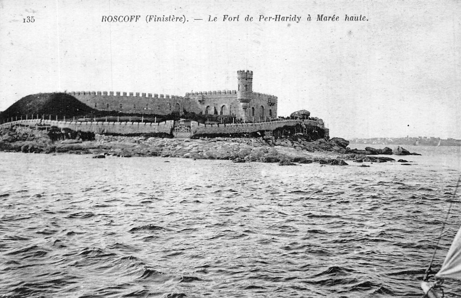 Vue générale à marée haute, carte postale. L'îlot est dépourvu d'arbre ou d'arbuste. L'ancien corps de garde est flanqué d'une tour créneléeImmatriculation