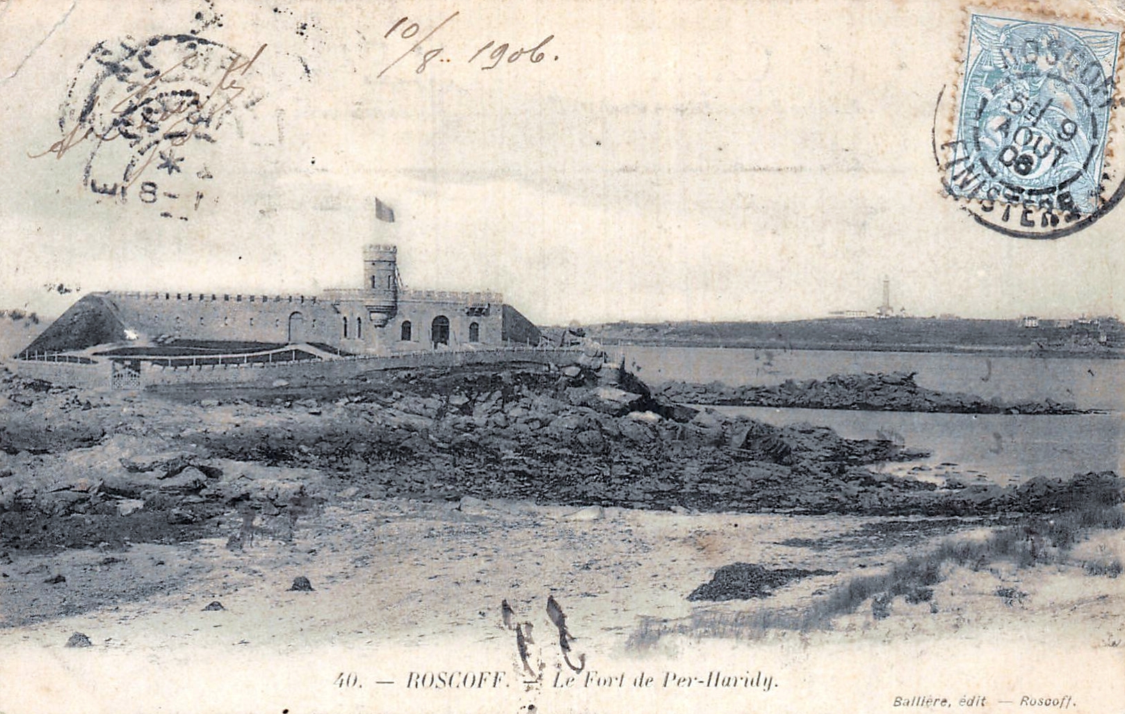 Vue générale à marée basse, carte postale (éditions Ballière Roscoff). L'îlot est dépourvu d'arbre ou d'arbuste. L'ancien corps de garde est flanqué d'une tour créneléeImmatriculation
