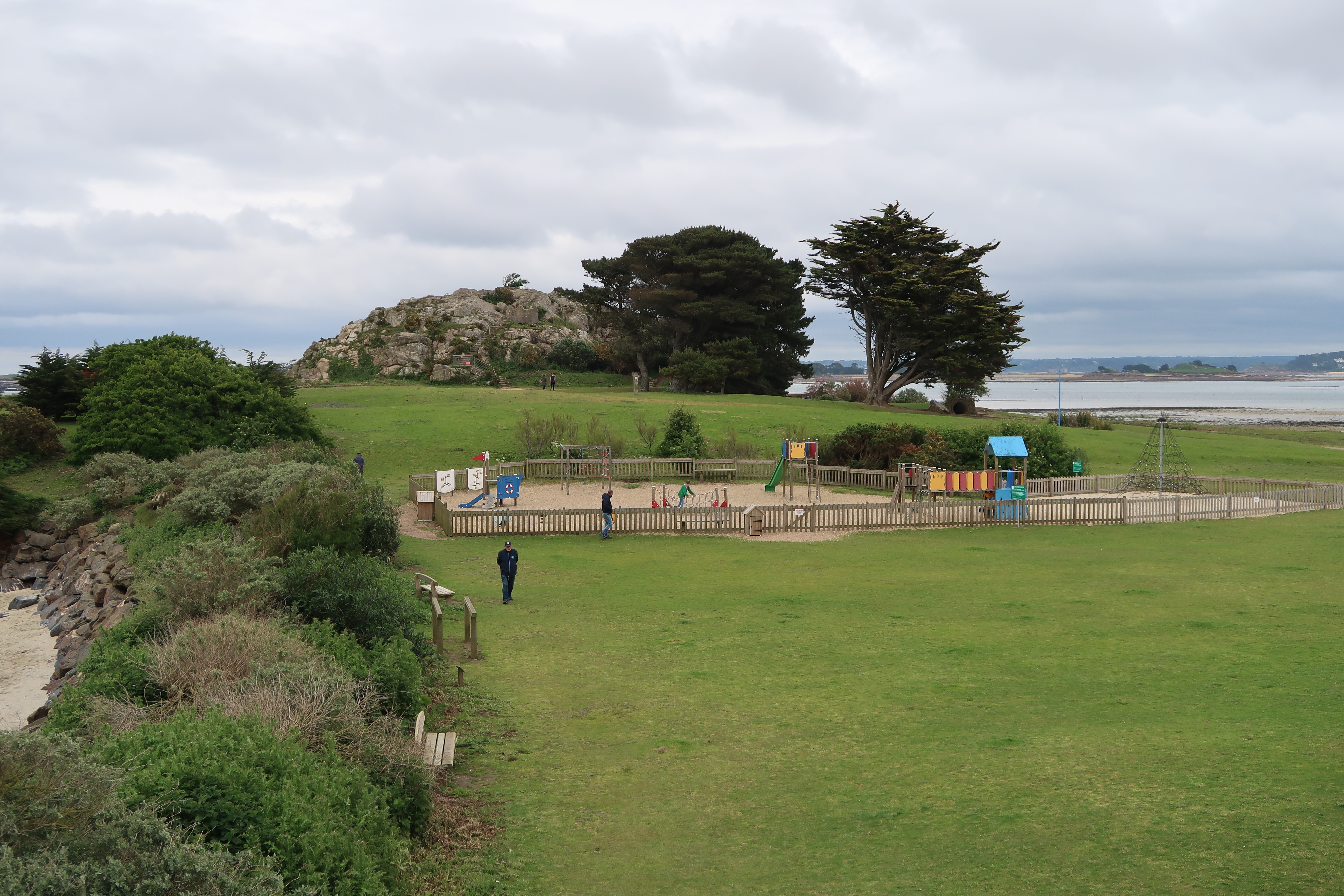 Vue de l'aire de jeux pour enfants depuis la plate-forme sommitale du four à chaux (état en 2023). En arrier-plan, le rocher Sainte-AnneImmatriculation