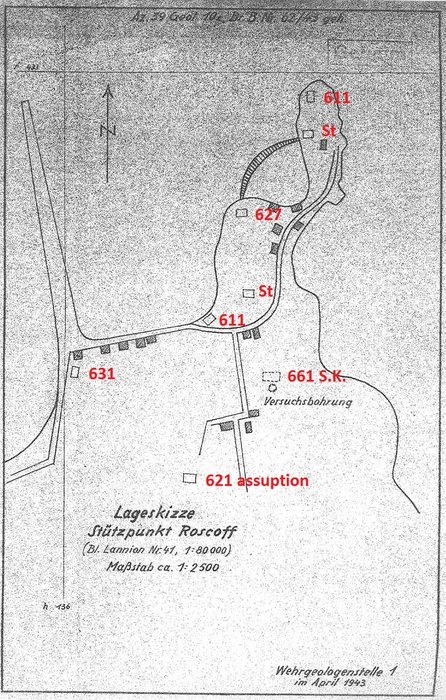 Carte de situation (Lageskizze) du Stützpunkt Roscoff, avril 1943 (les numéros des plans-types ont été ajoutés par Jopaerya, membre de Axis History Forum)Immatriculation