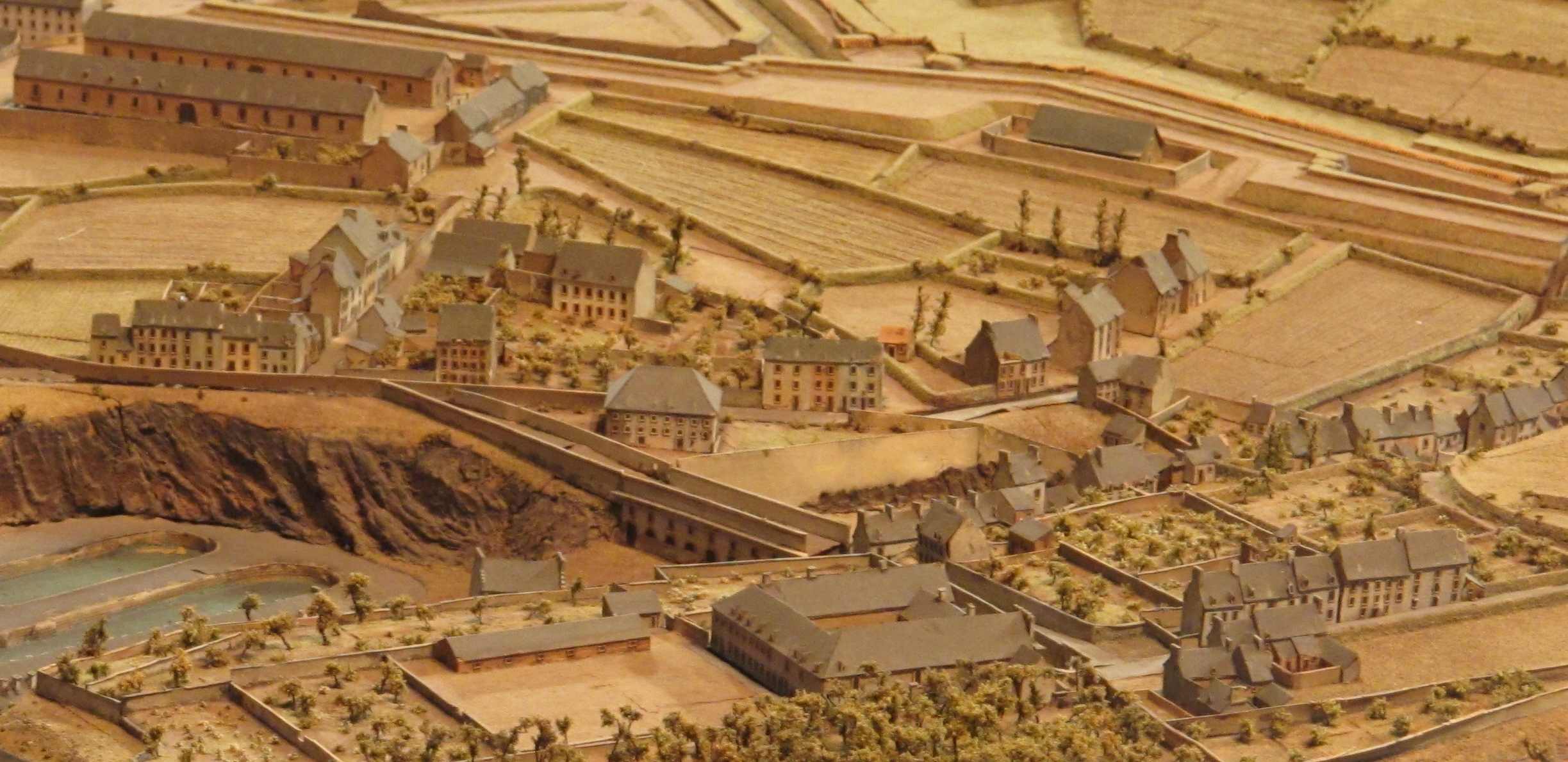 Vue du plan-relief de Brest depuis l'Est-nord-est (1807-1811) : la nouvelle prison maritime de Pontaniou est située immédiatement derrière le Bâtiment aux Lions. A gauche, les formes de PontaniouImmatriculation