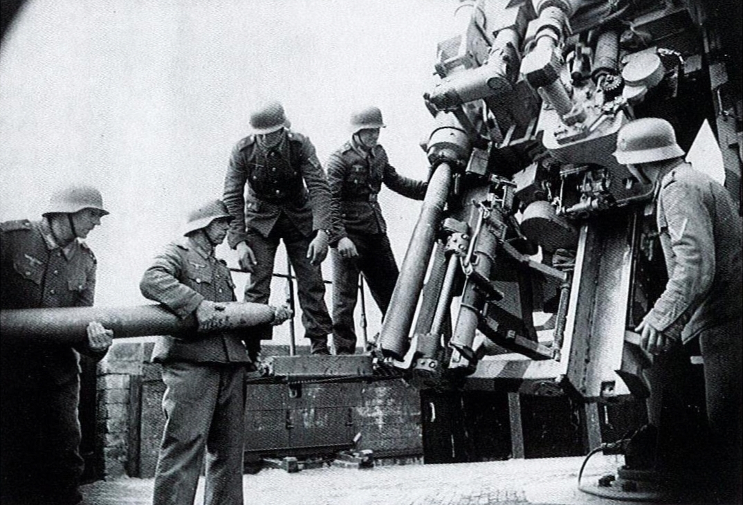 Vue de l'un des canons de la batterie antiaérienne baptisée Vulkan pendant la Seconde Guerre Mondiale : exercice de tirImmatriculation