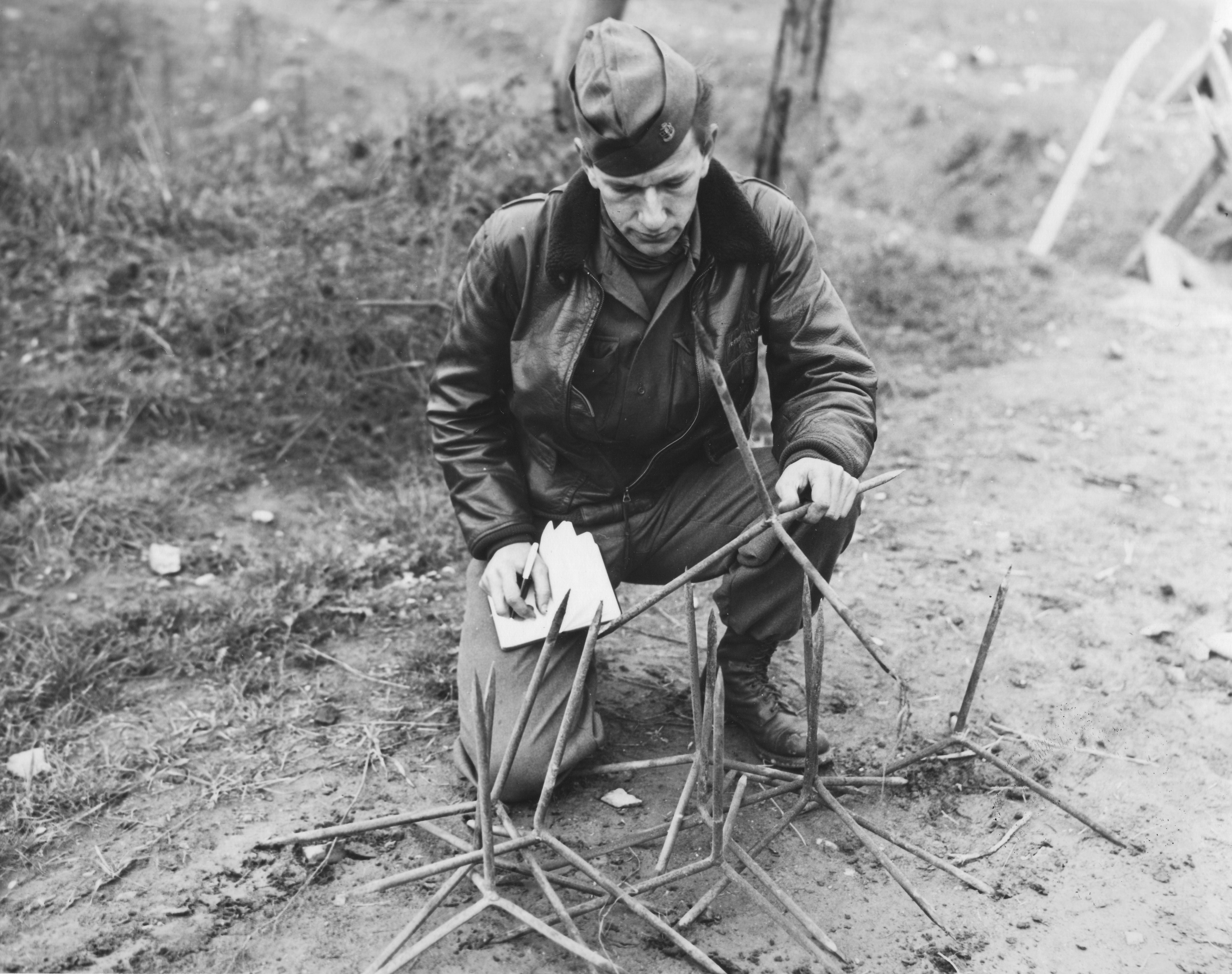 Vue d'un soldat américain examinant des chausse-trappes (United States Army Signal Corps, septembre 1944). Le soldat se situe juste au Sud du fossé anti-char, devant le poteau en boisImmatriculation