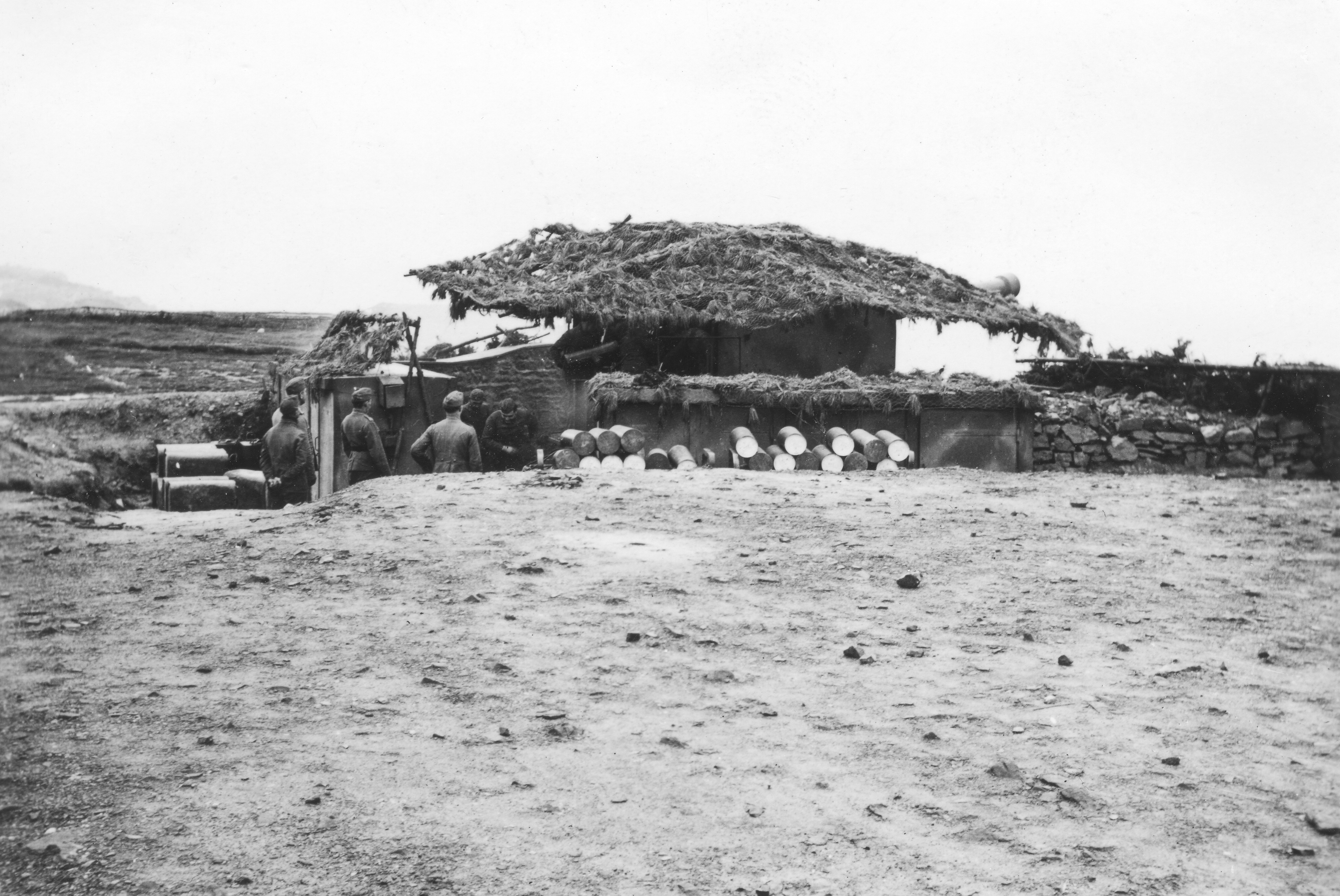 Vue de l'un des quatre canons de 164,7 mm avant la construction des casemates. La pièce d'artillerie est sommairement camouflée. Au premier plan, des gargoussesImmatriculation
