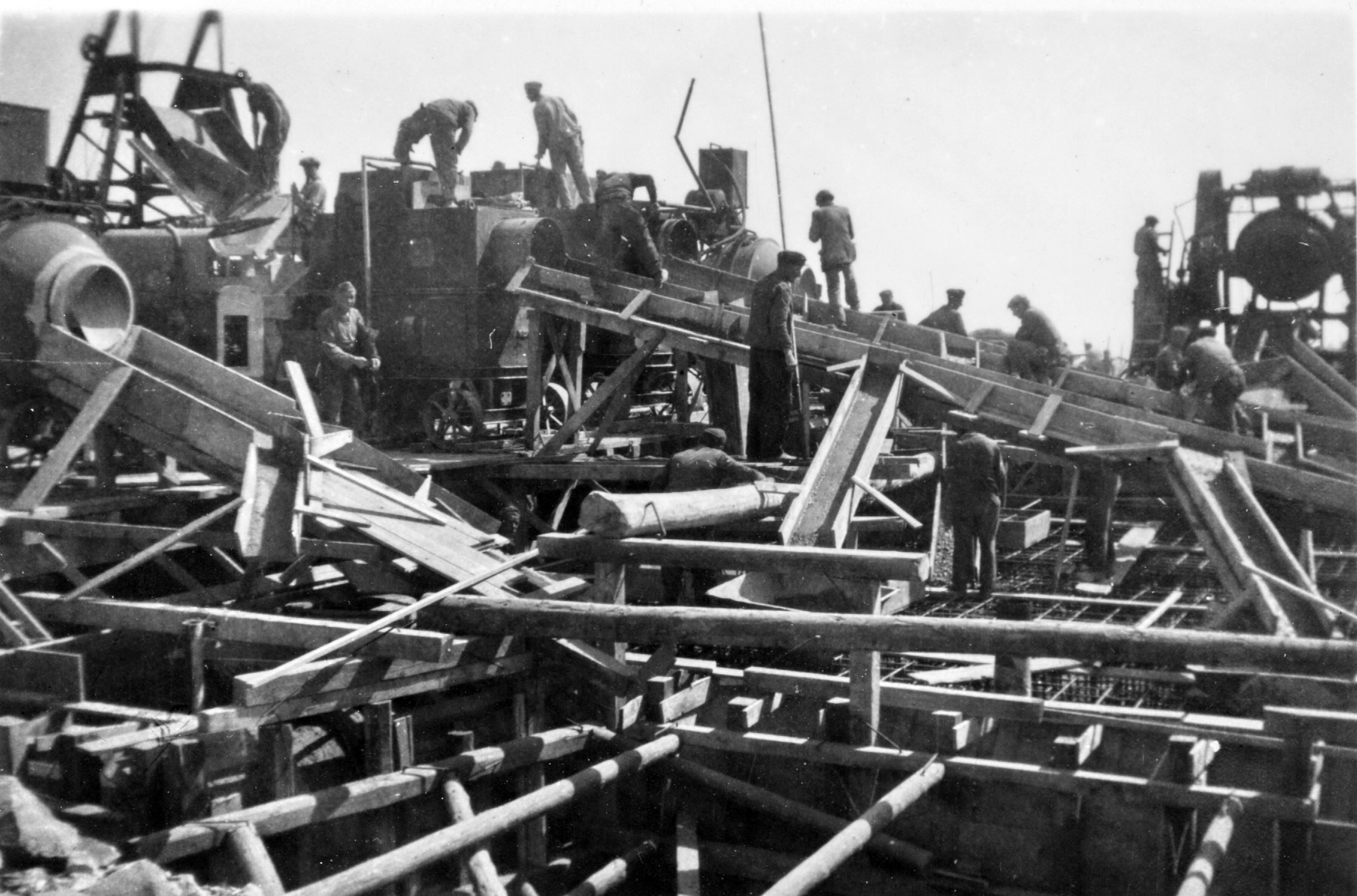 Vue de la construction d'un bunker. Quatre bétonnières sont positionnées pour la coulée du béton dans le coffrageImmatriculation