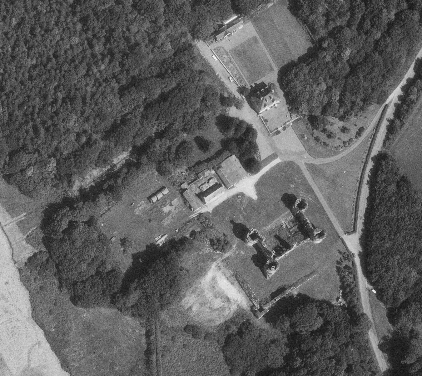 Vue aérienne verticale, 1980. L'intérêt de cette illustration est de montrer les vestiges de l'enceinte bastionnée située au sud du château (une tour de plan carré et deux courtines)Immatriculation