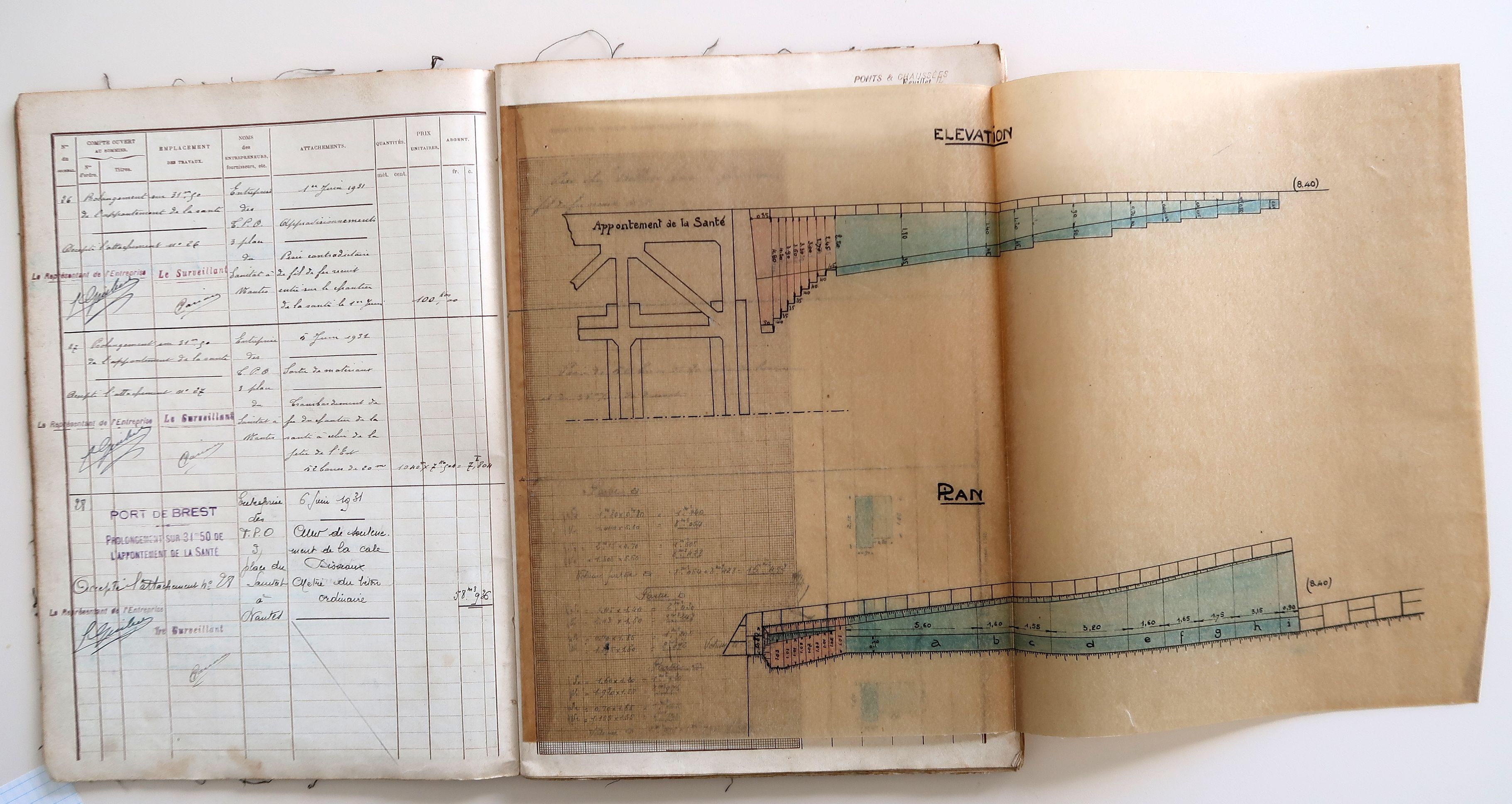 Cahier d'attachements, Plan et élévation de l'appontement de la Santé, 1931 (extrait)Immatriculation