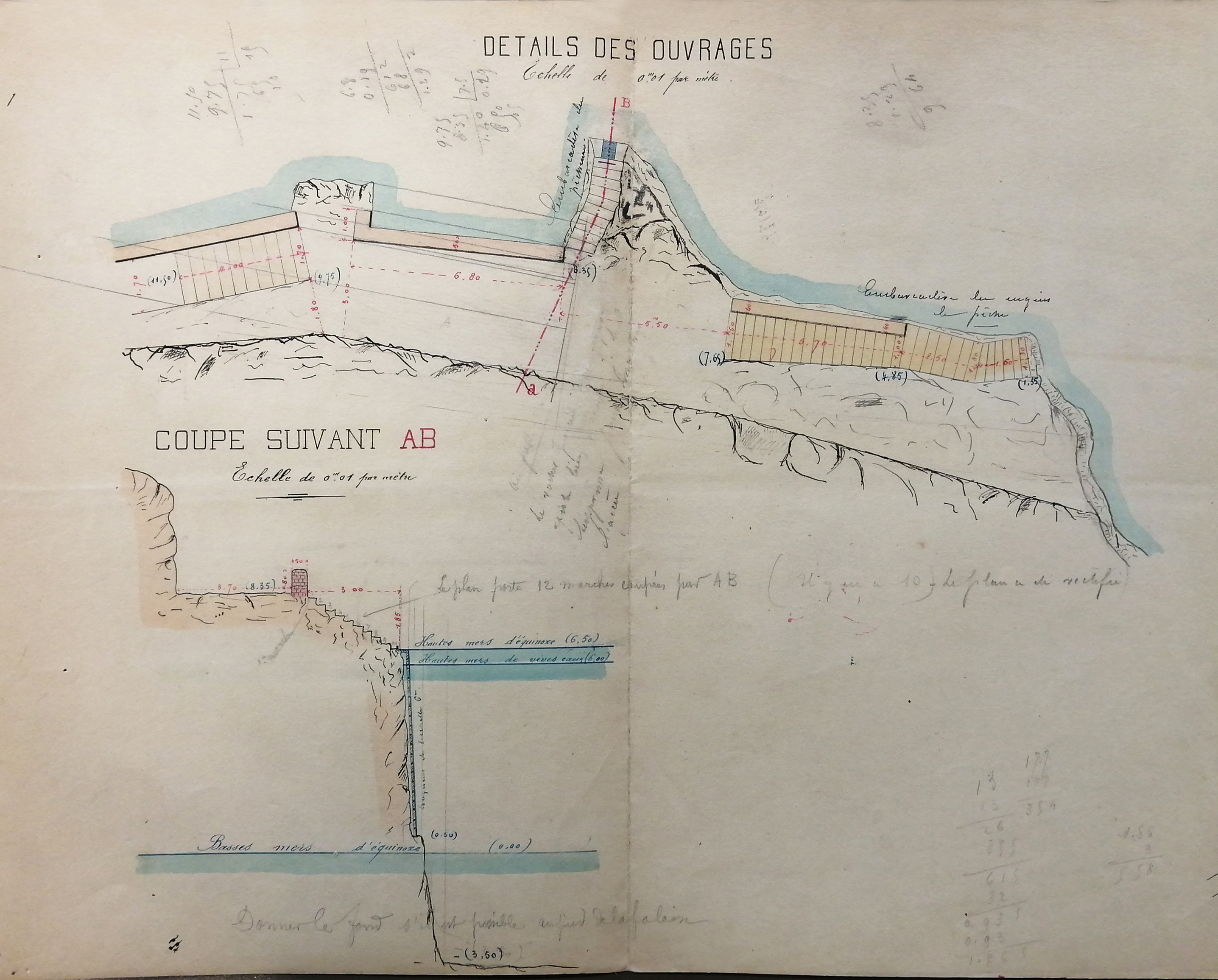 Création d'un débarcadère pour les pêcheurs, détail du débarcadère et des escaliers. Reproduction plan des Ponts et Chaussées, 1894.Immatriculation