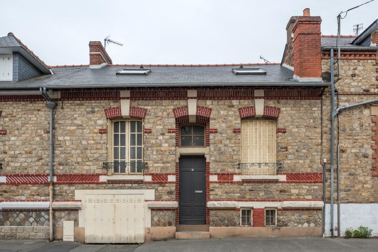 Rue Villeneuve, façade antérieure d'une maison en rez-de-chaussée surélevé de 'style du bassin rennais'Immatriculation