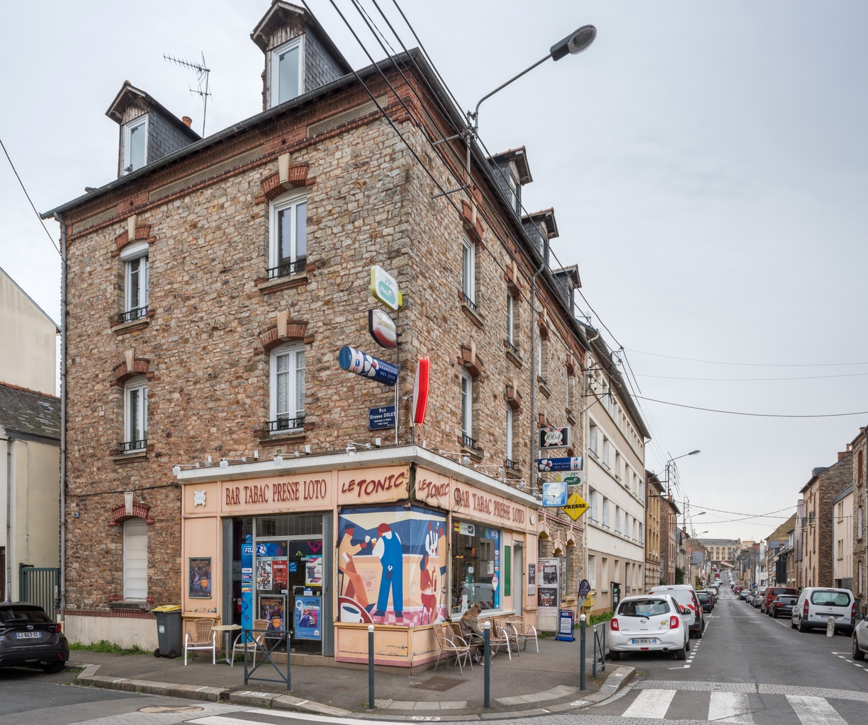 Rue Ange Blaize, vers l'est, avec immeuble d'angle abritant le bar 'Le Tonic' au rez-de-chausséeImmatriculation