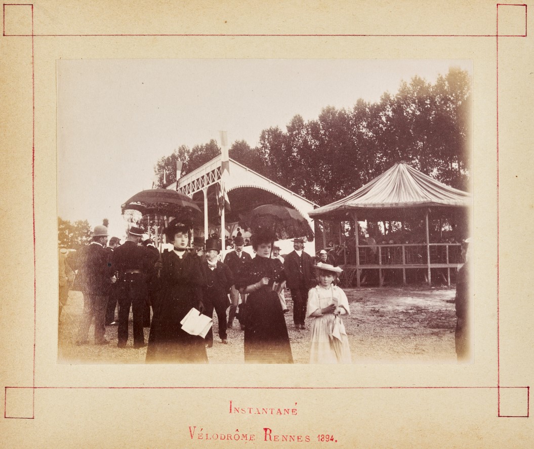 Les installations primitives du vélodrome de Rennes en 1894 avec la tribune et le kiosque à musique, photographie d'Ange Colombo, Musée de BretagneImmatriculation