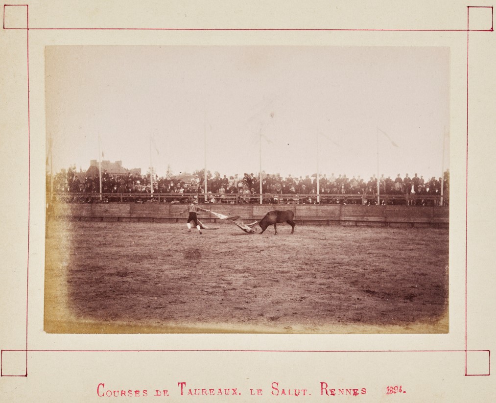 Organisation d'une 'course de taureau' sur le vélodrome de Rennes, photographie d'Ange Colombo, 1894, Musée de BretagneImmatriculation