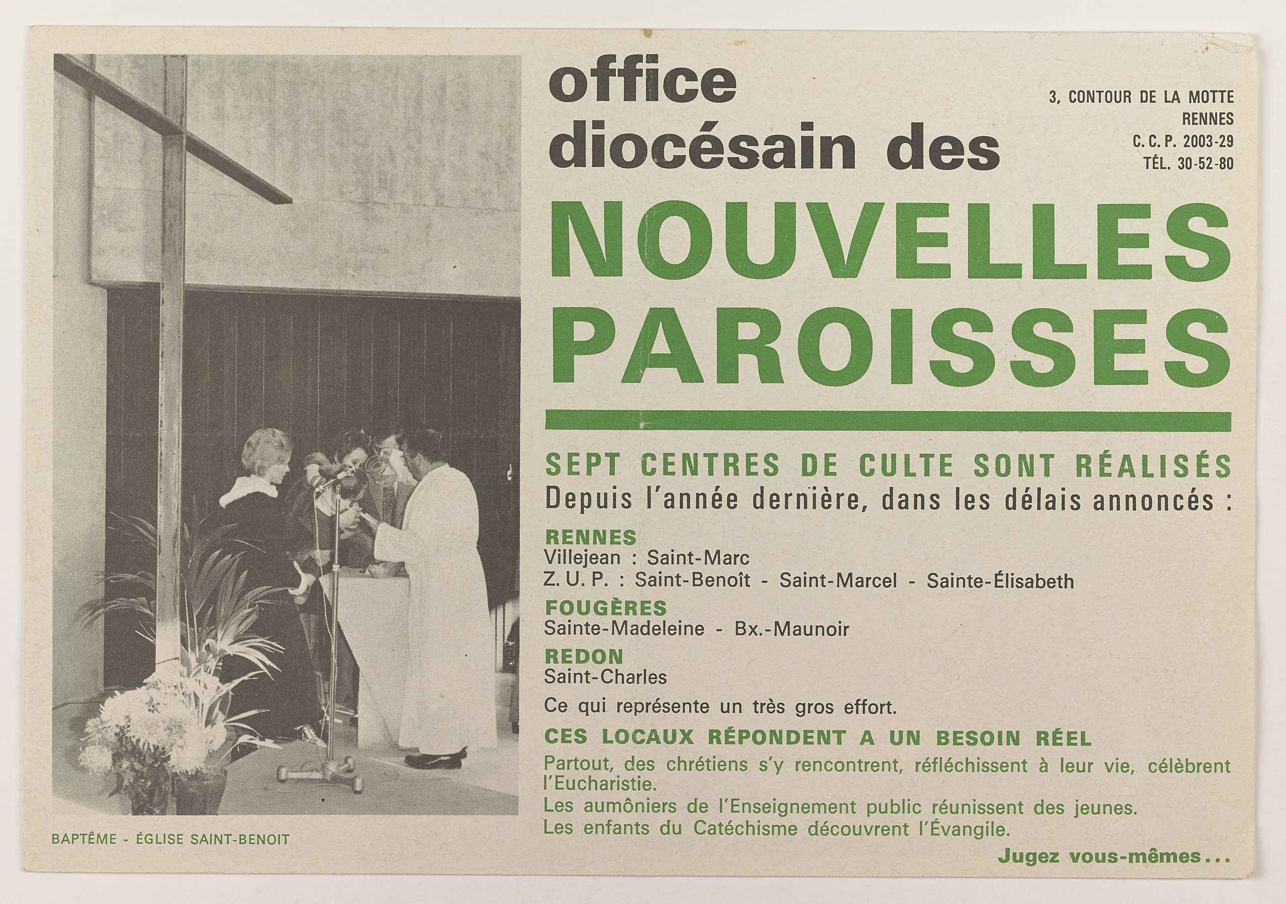 Feuillet de l'office diocésain des nouvelles paroisses destiné à encourager les dons des fidèles, 1970, coll. Musée de BretagneImmatriculation