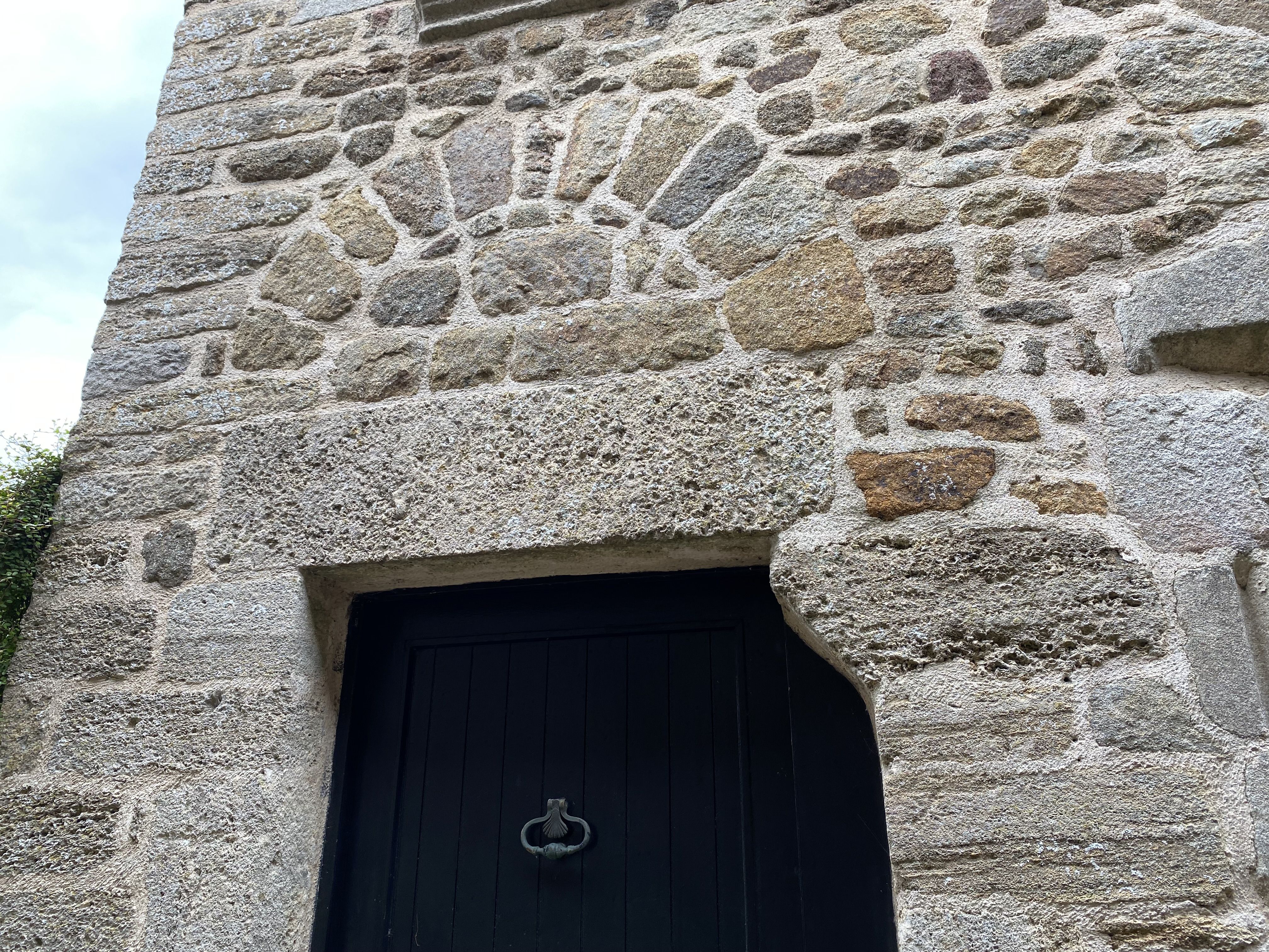 Façade antérieure, encadrement de la porte d'entrée avec de la pierre des faluns et du granit blond (2022)Immatriculation