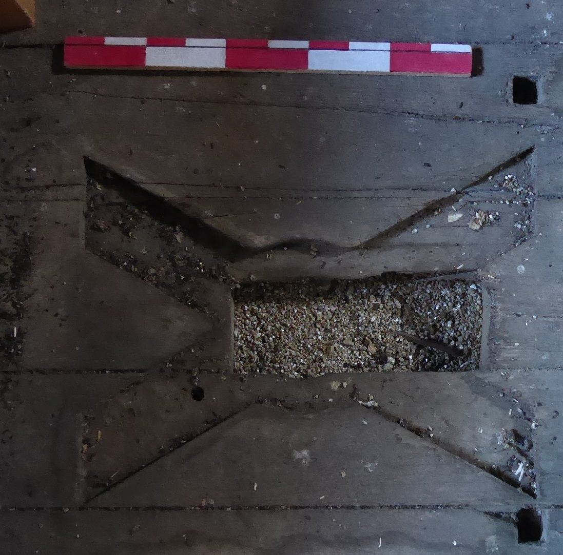 Minoterie, marques de l'implantation des machines dans le grenier (2022)Immatriculation