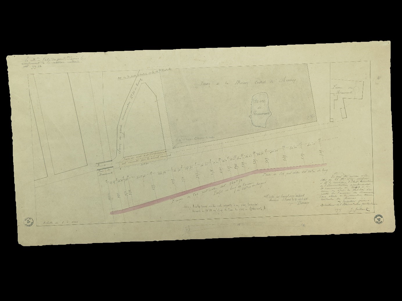 Plan du 18 avril 1861, annexé à la lettre du 26 octobre 1874 adressée à M. le conseiller d’Etat, directeur de l’administration départementale et communale au sujet de la mise en état de la mobilité d’une partie de l’avenue Beaumont aux abords de la nouvelle maison centrale de Rennes, par l’Inspecteur général, directeur de l’administration pénitentiaire, J. JaillantImmatriculation