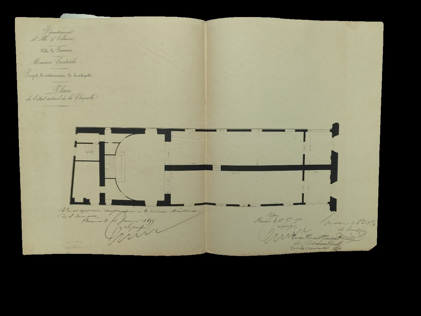 Projet d’appropriation de la Chapelle, plan intégrant la restauration proposée, le 24 novembre 1851 par Langlois, architecteImmatriculation