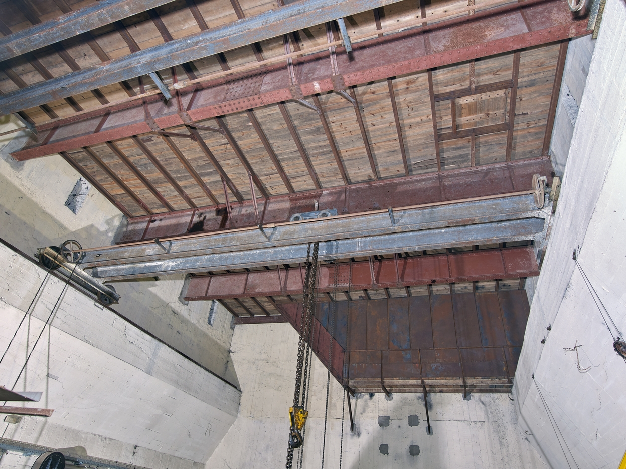 Vue générale du pafond de la salle avec ses deux ponts roulants bipoutres et treuils. Contre le mur du fond, galerie avec escalier permettant l'accès au niveau supérieur depuis la chaudronnerieImmatriculation