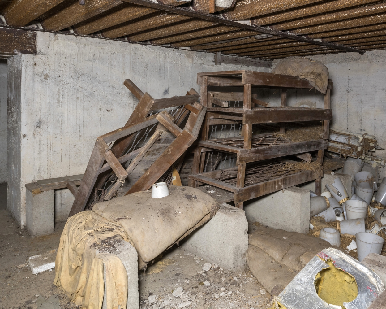 Vue de l'une des deux salles (1) : empilement de sommiers en bois sur deux rangées de bancs en béton encore surmontés de leurs assises en boisImmatriculation