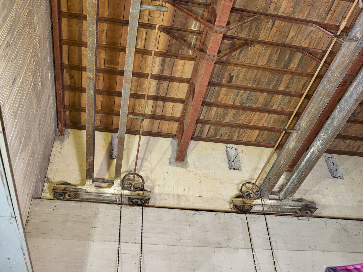 Vue des deux ponts roulants bipoutres. Les chaînes permettent le déplacement longitudinal des ponts roulantsImmatriculation