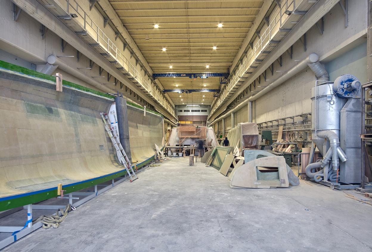 Vue générale de la nef n° 1 depuis l'extrémité nord (le tirant d'air est de 15 m). Elle est dotée de deux ponts roulants. De part et d'autre de la nef se trouvent des passerelles. La nef abrite le chantier naval Marsaudon CompositesImmatriculation