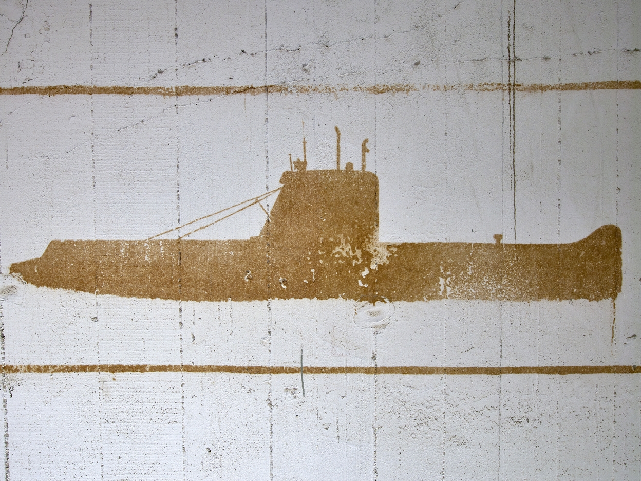Vue de l'une des peintures murales d'origine française de la nef n° 1 : représentation d'un sous-marin de type "Daphné" (passerelle ouest). La nef abrite le chantier naval Marsaudon CompositesImmatriculation