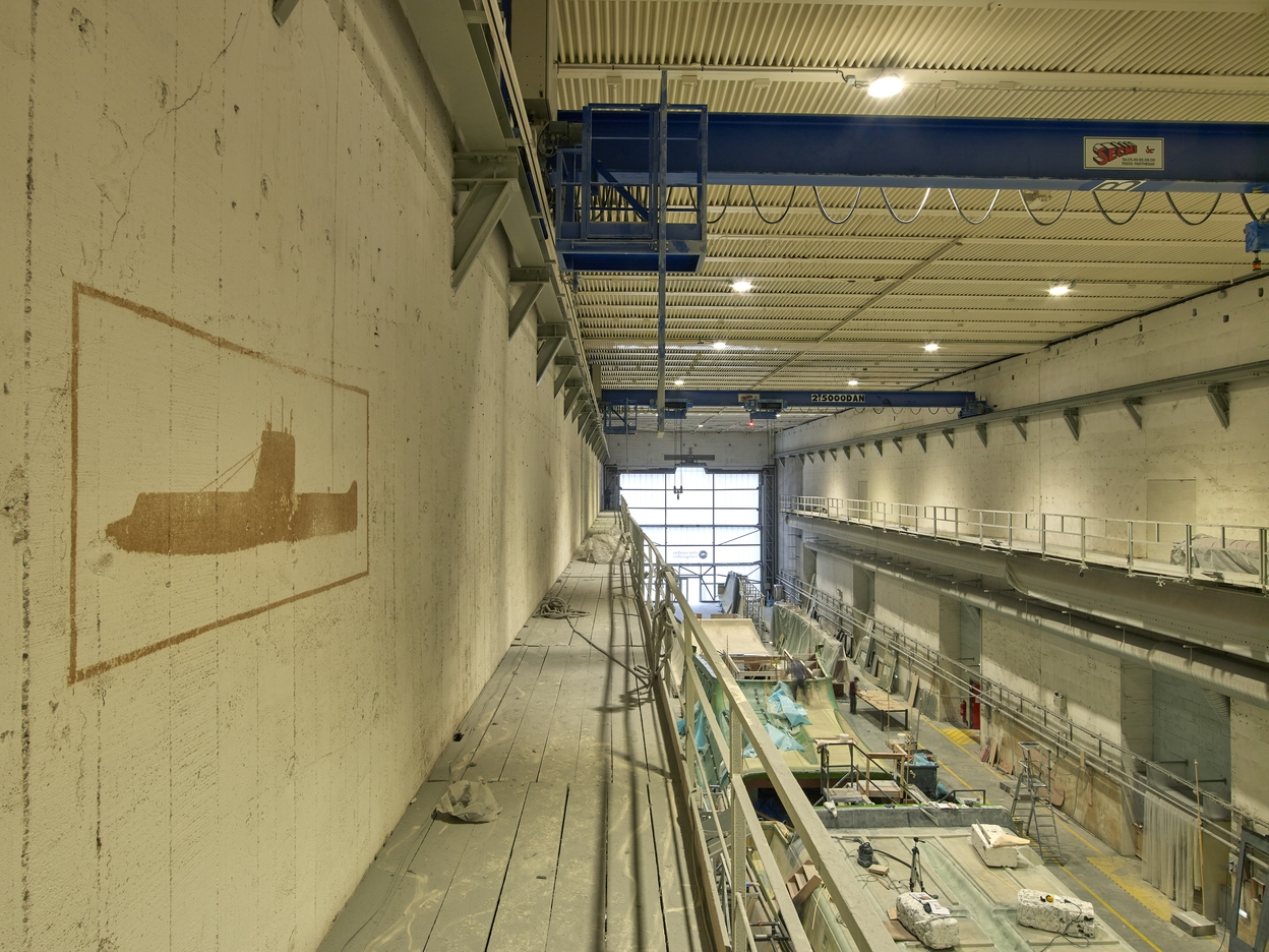 Vue de la passerelle ouest de la nef n° 1. A gauche sur le mur, l'une des peintures murales d'origine française : représentation d'un sous-marin de type "Daphné". La nef abrite le chantier naval Marsaudon CompositesImmatriculation