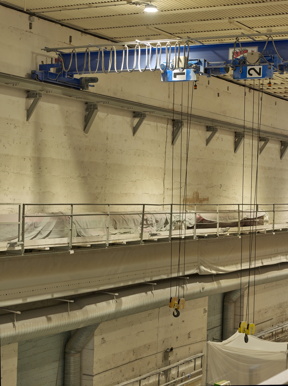 Vue de la passerelle est et de l'un des deux ponts roulants de la nef n° 1. Sur le mur, l'une des peintures murales d'origine française : représentation d'un sous-marin de type "Daphné". La nef abrite le chantier naval Marsaudon CompositesImmatriculation