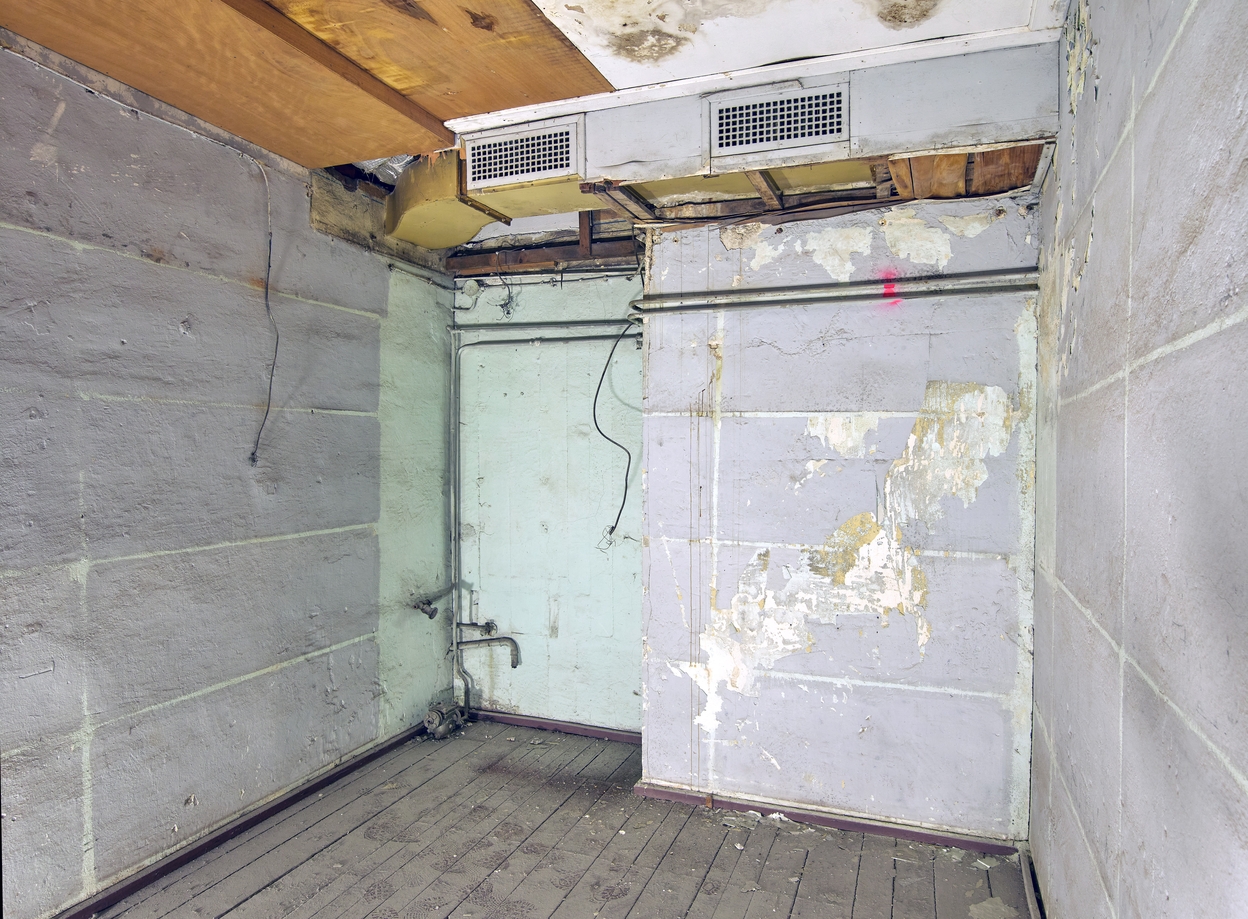 Vue de l'une des pièces du troisième étage de la nef n° 3 : bureau (en 1945). A signaler : plancher en bois, emplacement d'un radiateur et système de ventilation par bouches de soufflageImmatriculation