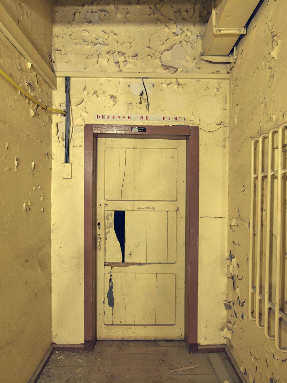 Vue du couloir du troisième étage de la nef n° 3 desservant des bureaux (en 1945). Au-dessus de la porte, on peut lire "Magasin d'habillement" ; "Défense de fumer". Derrière la porte, accès au troisième étage de la nef n° 4Immatriculation