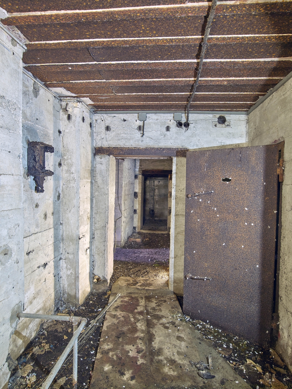 Vue du bunker du double encuvement antiaérien situé sur la dalle de couverture : couloir du sas et porte étancheImmatriculation