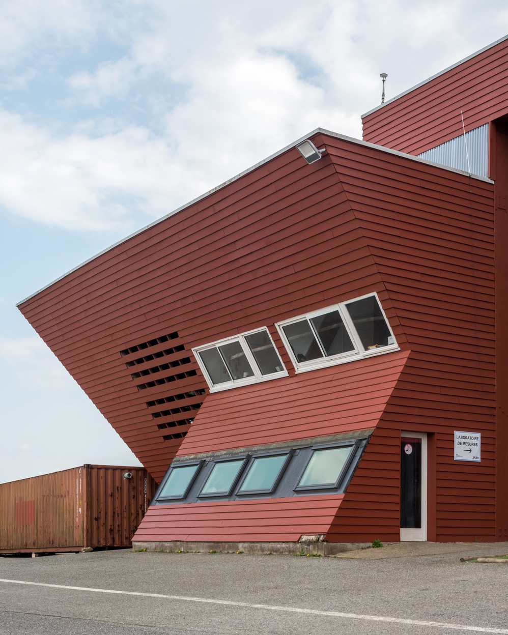 Locaux techniques, bardés de lattes de bois posées horizontalement et peintes de couleur rouge brique. Architecte Yves Guillou.Immatriculation