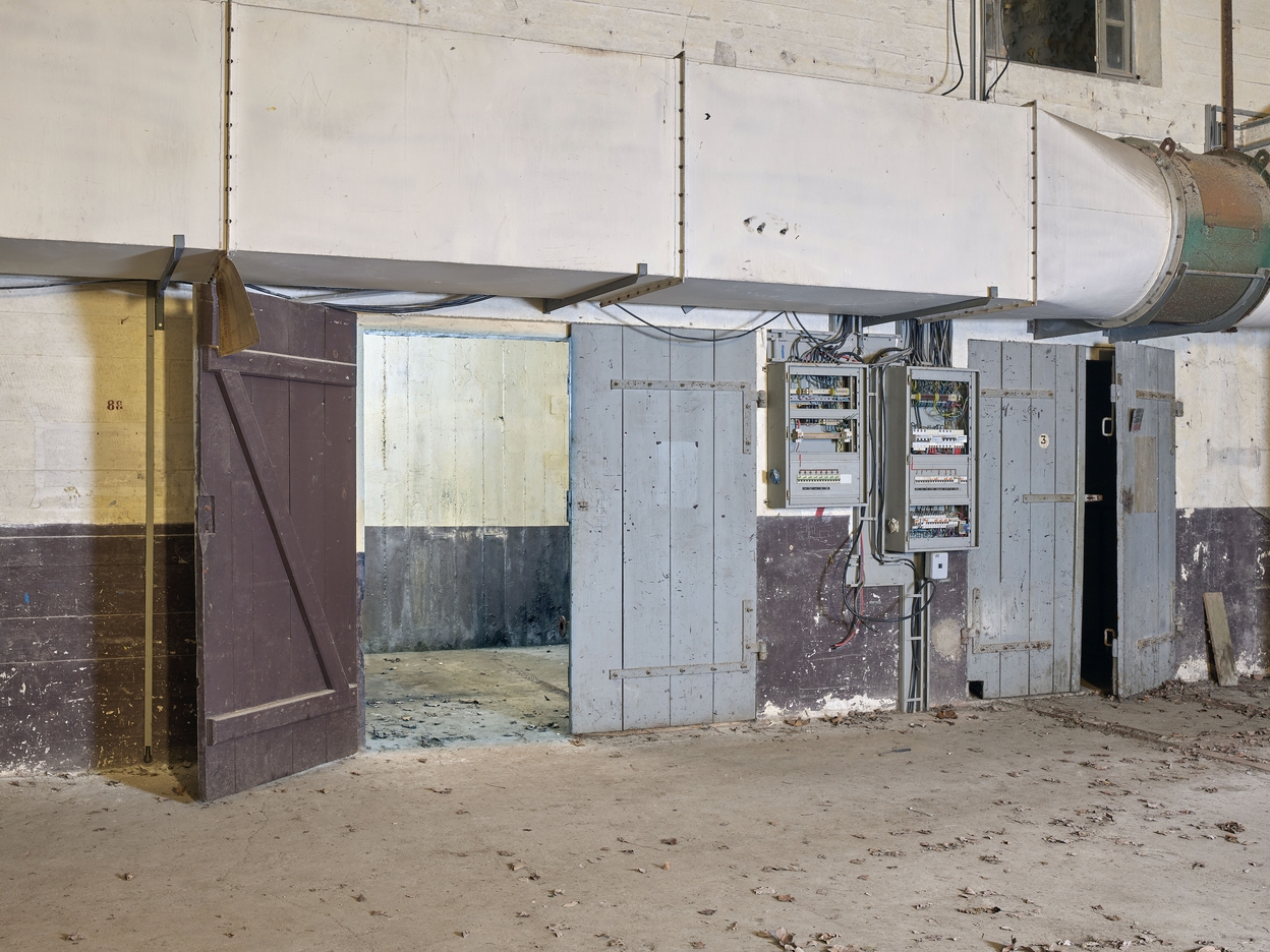 Locaux techniques, partie nord, rez-de-chaussée, grande pièce de la centrale électrique : magasins implantés contre le mur ouest. Ils sont fermés par des portes à deux battants en bois. Entre les deux magasins, tableaux électriques récentsImmatriculation
