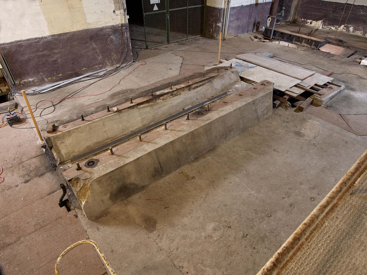 Locaux techniques, partie sud, rez-de-chaussée, grande pièce de la centrale électrique : socle en béton armé du générateur (des tiges filetées émergent du socle)Immatriculation