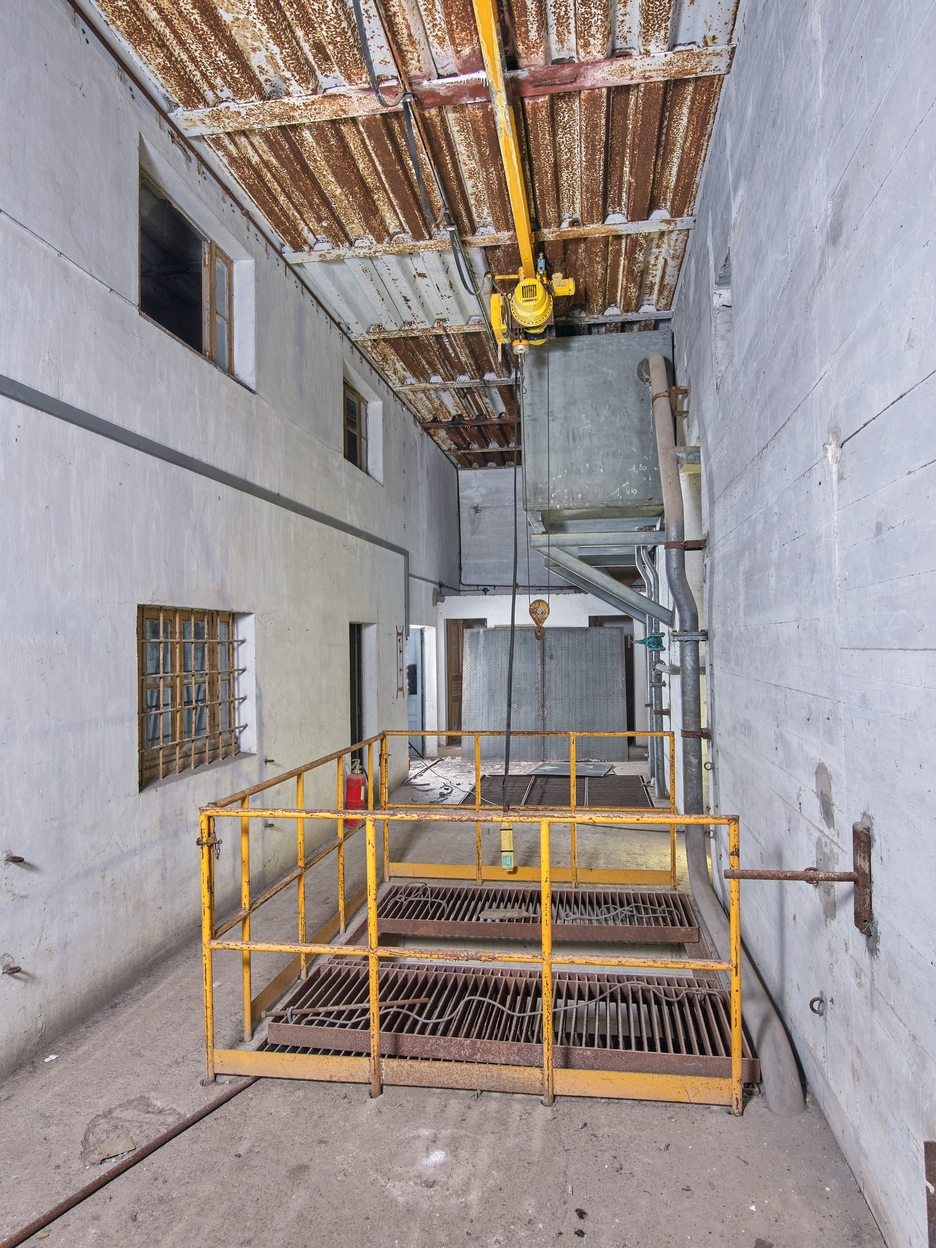 Locaux techniques, partie nord, premier étage : espace central de circulation, puits dans le sol et monorail pour treuil électrique. Un grand réservoir métallique (caisse de réserve) est fixé en hauteur contre le mur de refendImmatriculation