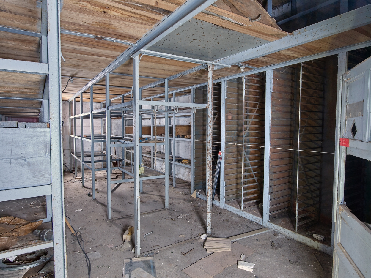 Locaux techniques, partie nord, premier étage : magasin n° 4 sur deux niveaux encore doté de ses étagères de stockage. Sur les plaques de la porte à deux battants, on peut lire : Rechanges Oerlikon Fusibles H[aute] T[ension] ; Défense de fumer et le n° 4Immatriculation