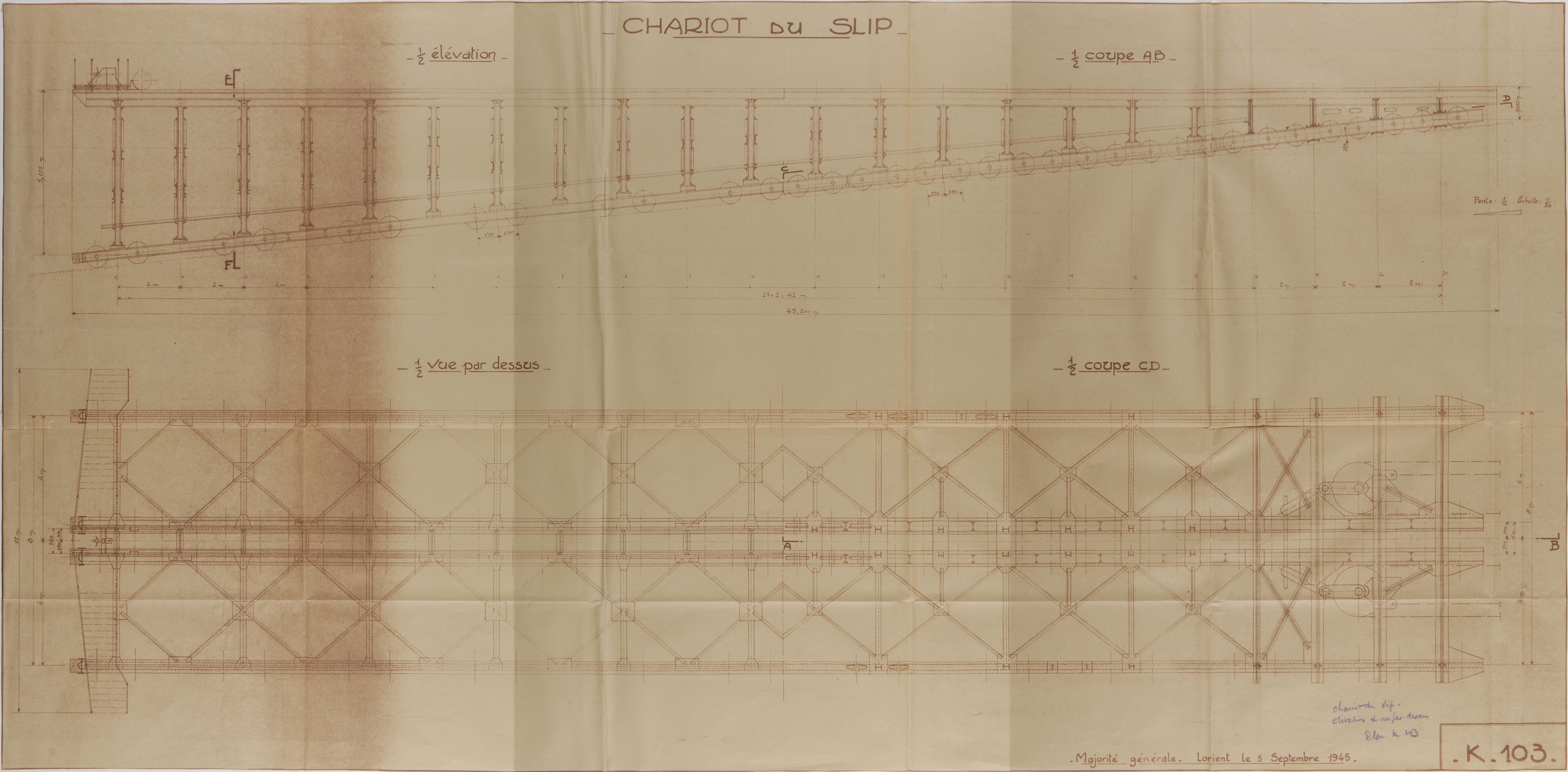 Coupes et élévations du chariot du slipway, plan K n° 103, 5 septembre 1945 (Service Historique de la Défense de Lorient, Monographie de la base "Ingénieur Général Stosskopf", 1945-1946)Immatriculation