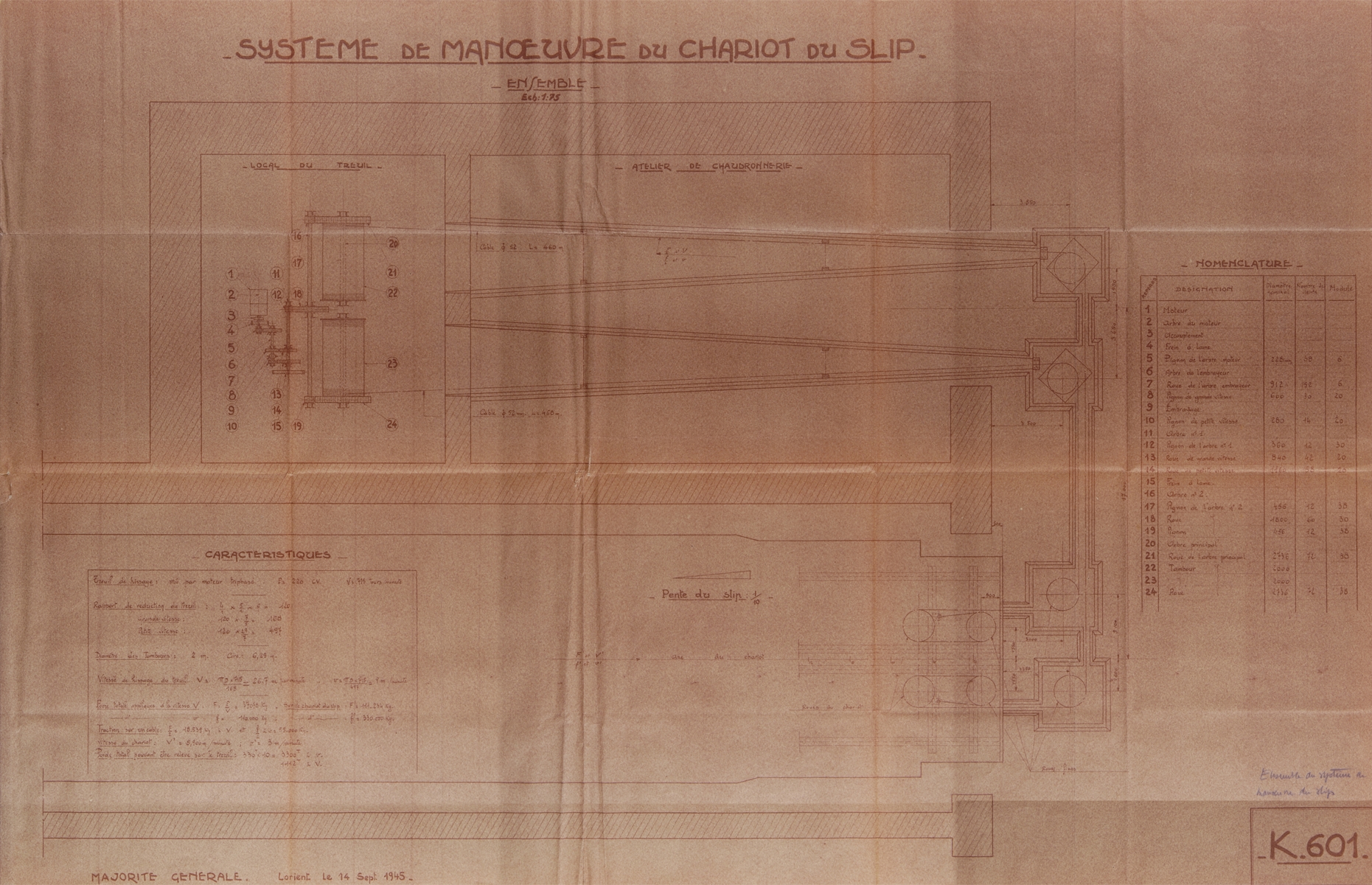 Plan du système de manoeuvre du chariot du slipway, plan K n° 601, 14 septembre 1945 (Service Historique de la Défense de Lorient, Monographie de la base "Ingénieur Général Stosskopf", 1945-1946)Immatriculation
