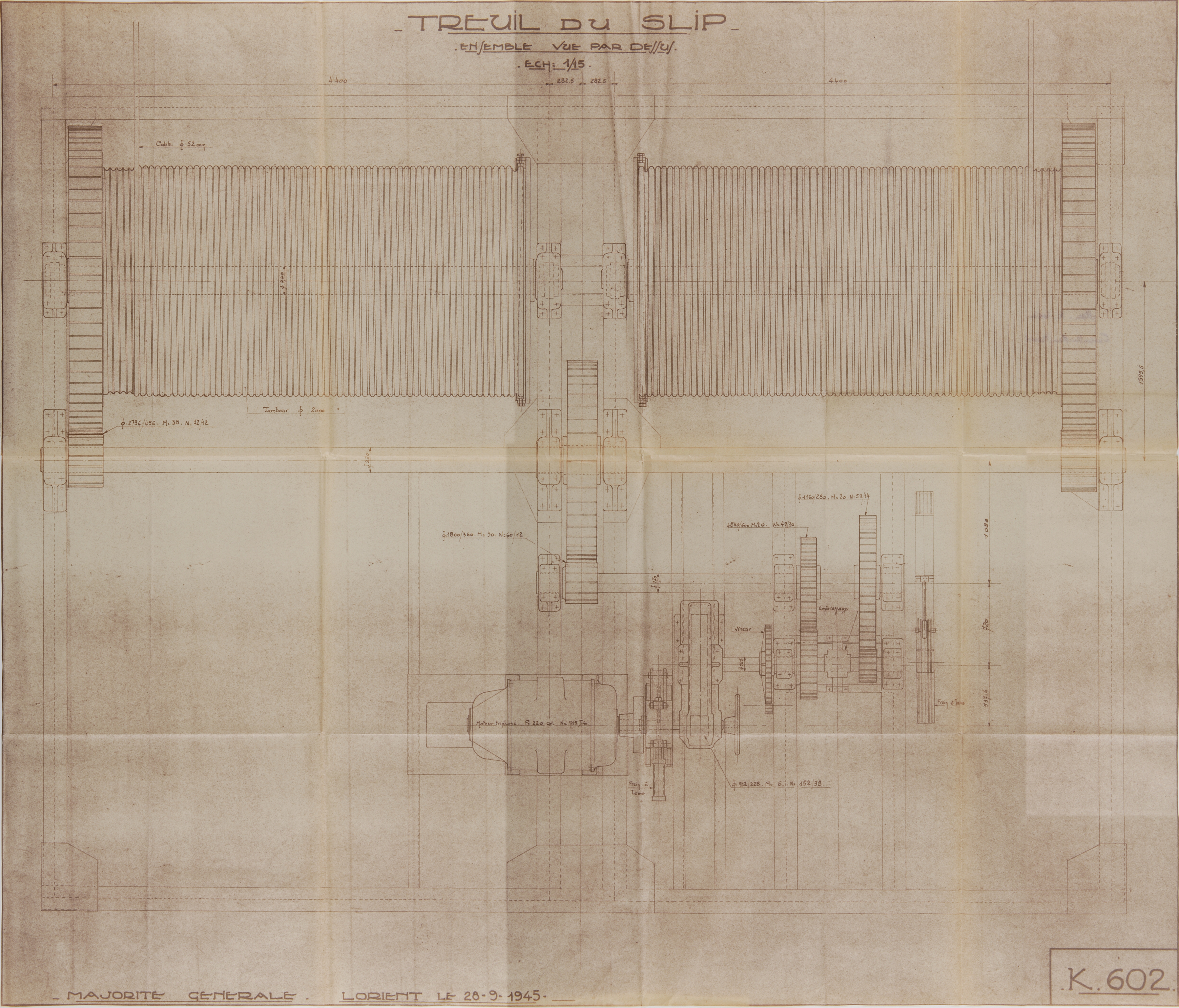 Vue de dessus du treuil du slipway, plan K n° 602, 28 septembre 1945 (Service Historique de la Défense de Lorient, Monographie de la base "Ingénieur Général Stosskopf", 1945-1946)Immatriculation