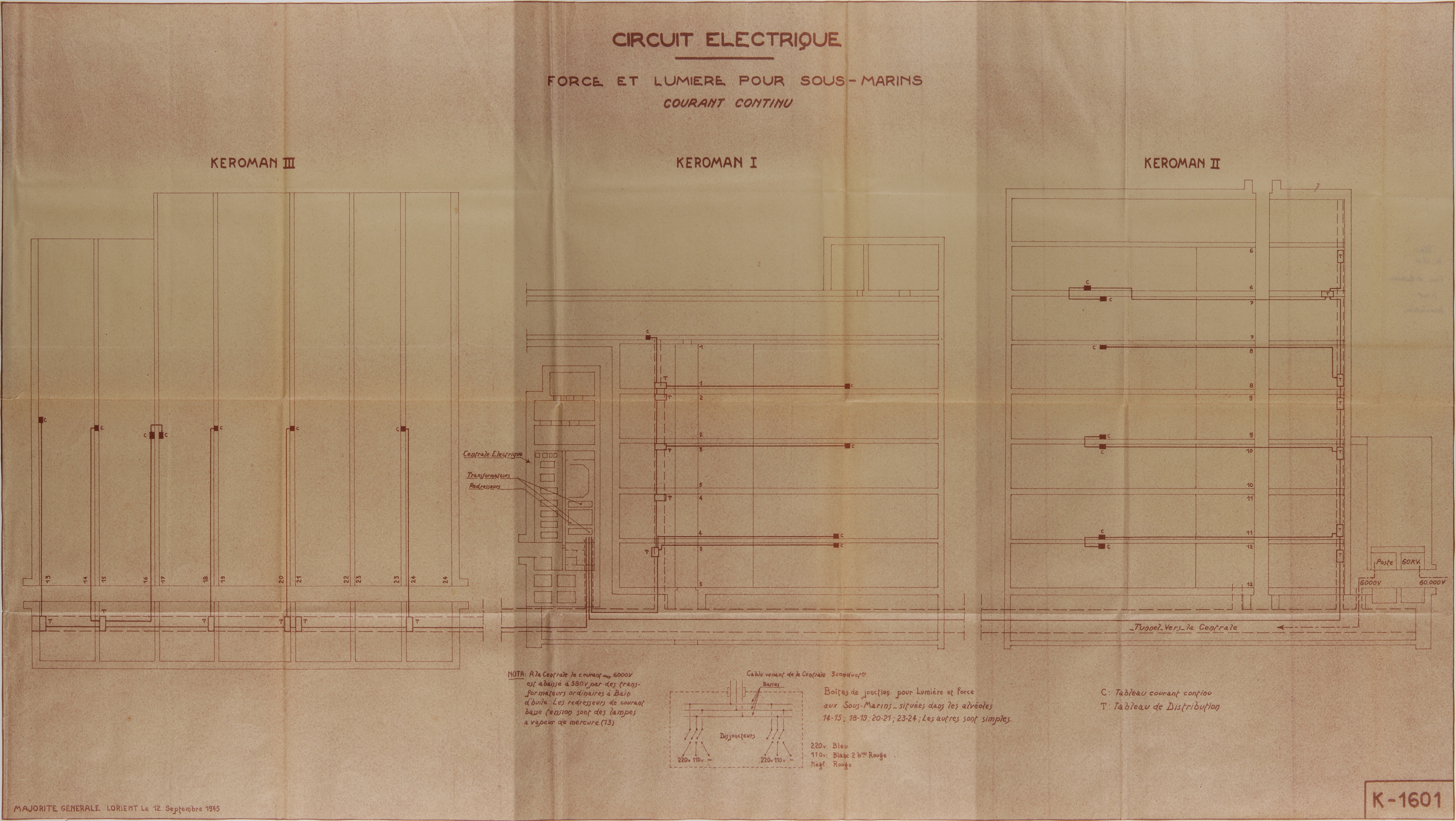 Plan du circuit électrique de Keroman : force et lumière pour les sous-marins (courant continu), plan K n° 1601, 12 septembre 1945 (Service Historique de la Défense de Lorient, Monographie de la base "Ingénieur Général Stosskopf", 1945-1946)Immatriculation