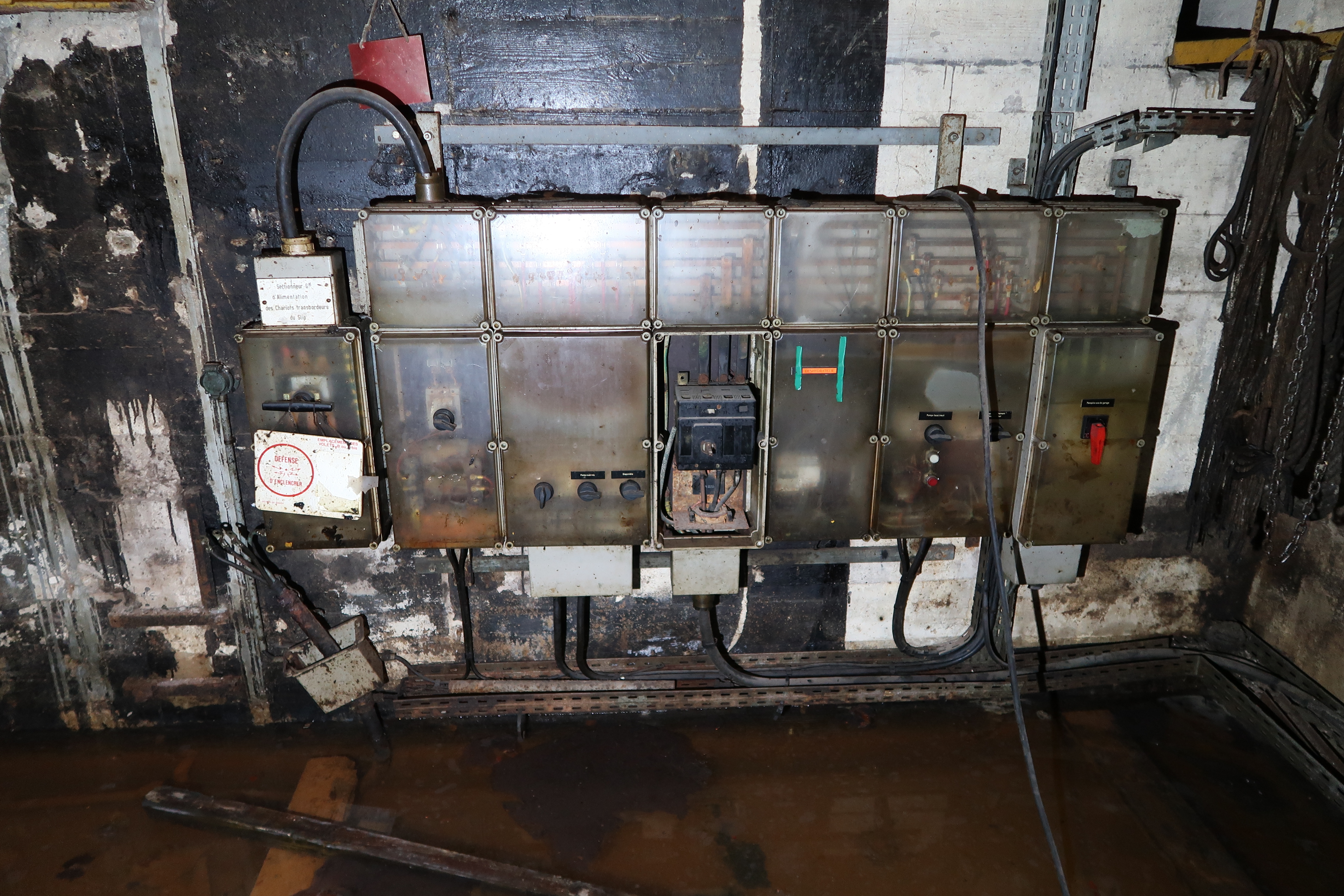 Vue des armoires électriques (n° 1). On peut lire : Sectionneur G[énér]al d'alimentation des chariots transbordeurs du slip, Pompe local treuil... et signalétique DÉFENSE D'ENCLENCHERImmatriculation