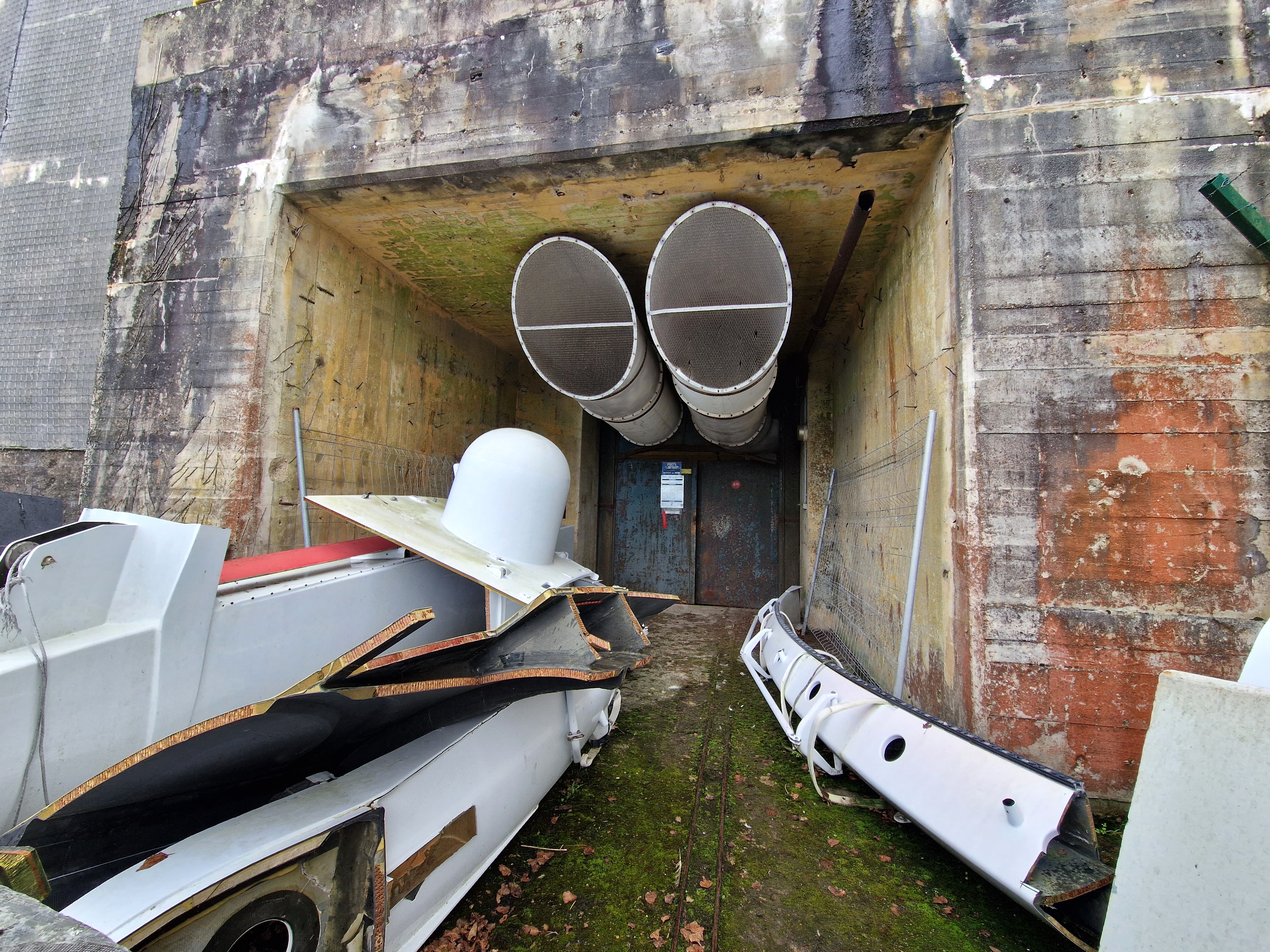 Locaux techniques : entrée nord avec petite avancée de protection. Au-dessus de la porte débouche deux gaines de ventilationImmatriculation