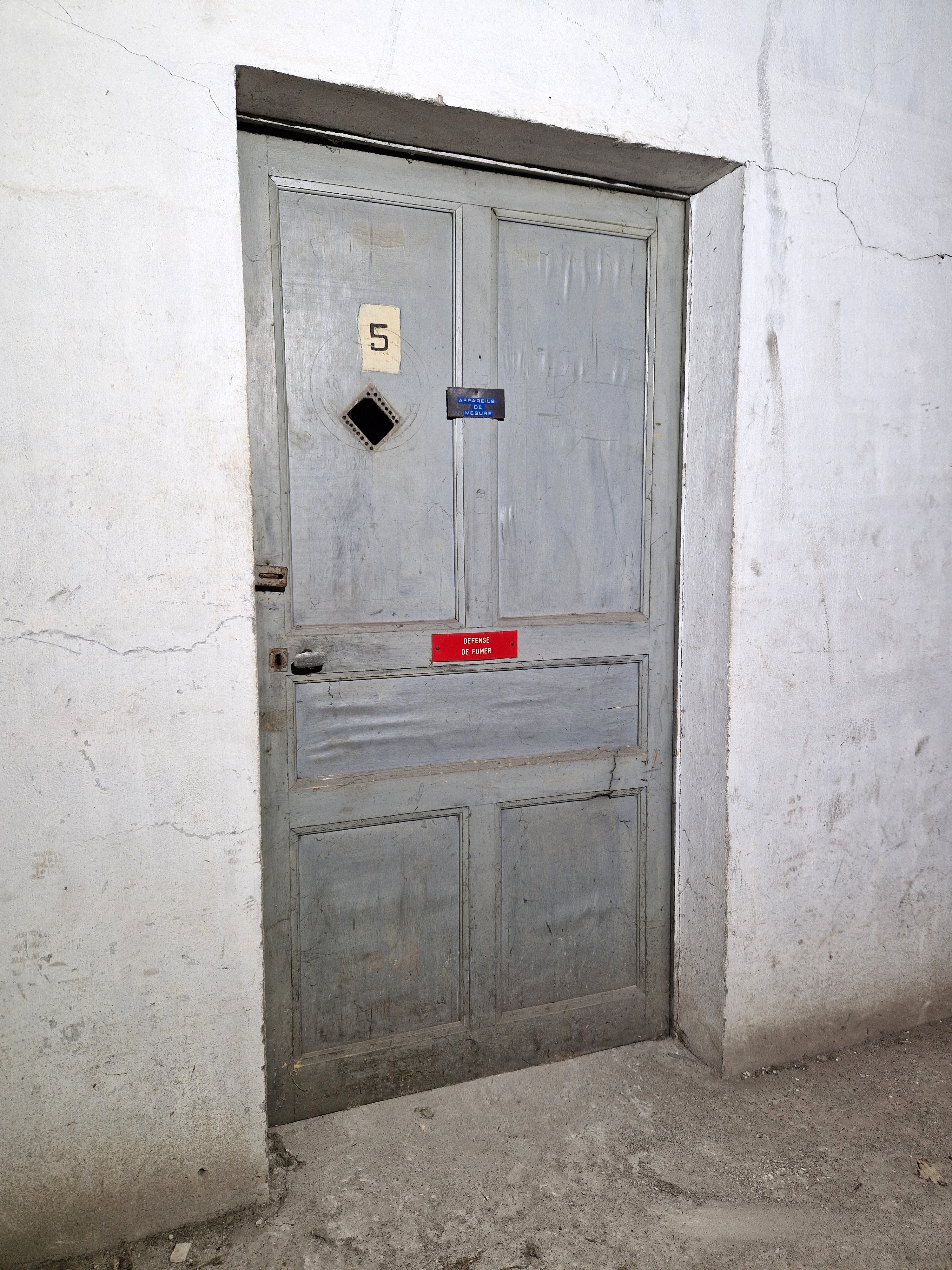 Locaux techniques, partie nord, premier étage : espace central de circulation, porte du magasin n° 5. Sur la porte, on peut lire le numéro 5 peint en noir (numérotation d'origine ?) et sur les étiquettes : Appareils de mesure ; Défense de fumerImmatriculation