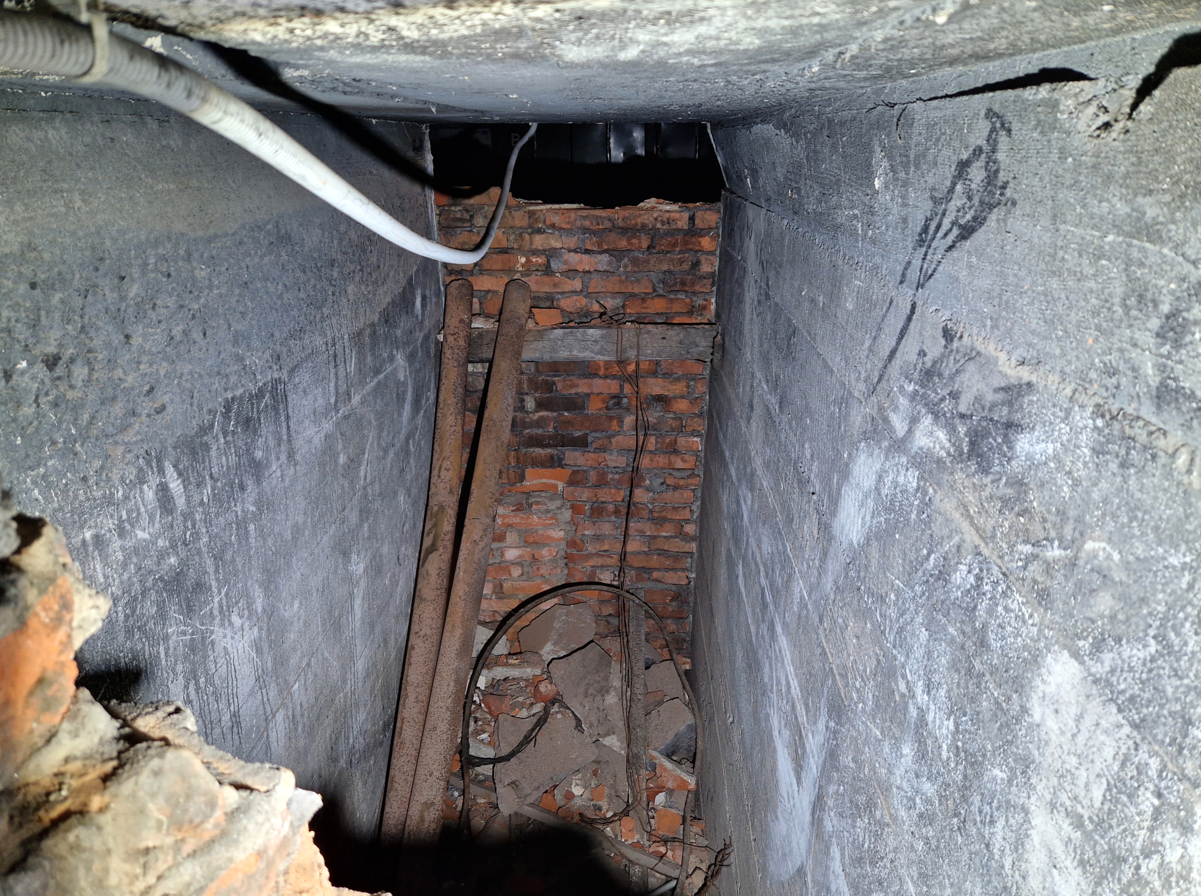 Locaux techniques, partie nord, premier étage : passage débouchant dans l'alvéole nord (le mur en béton armé mesure 3 m d'épaisseur). Ce passage est actuellement muré par des briques montées au cimentImmatriculation