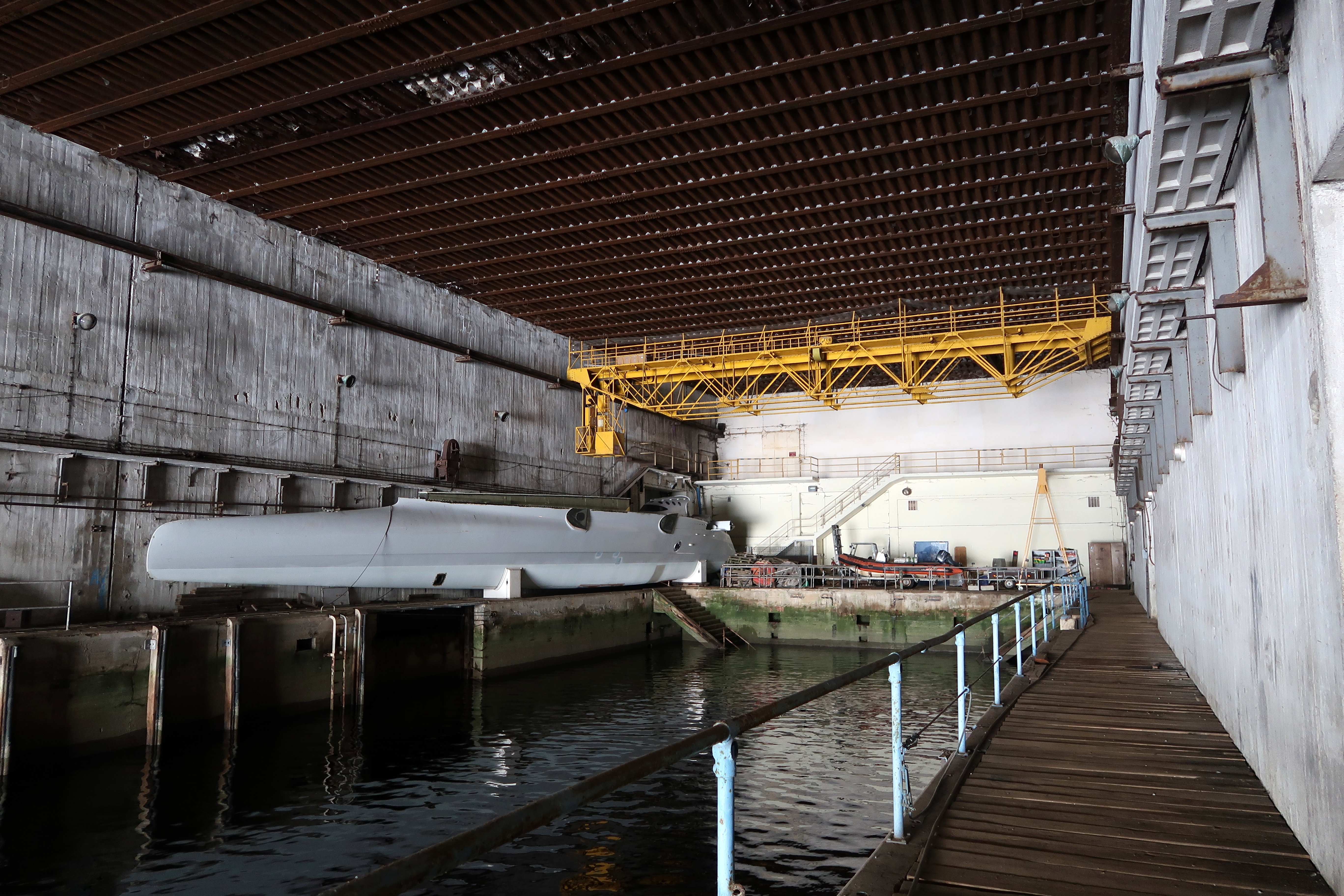 Vue du fond de l'alvéole nord depuis le quai central (état en 2023). Sur le quai nord, la coque centrale du trimaran Oman AirImmatriculation
