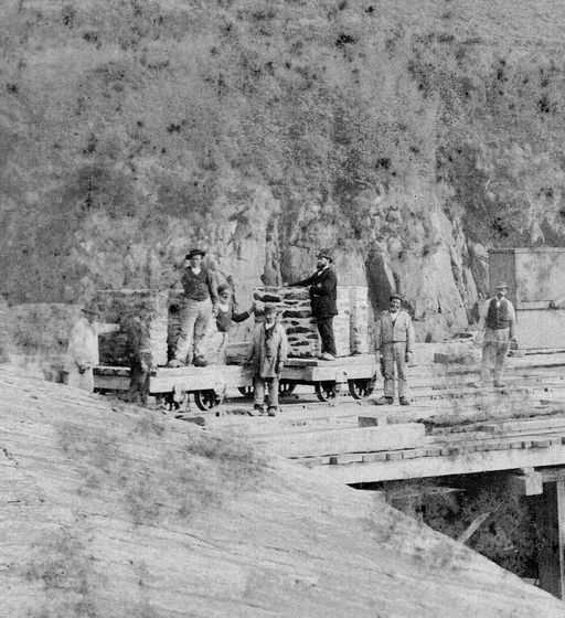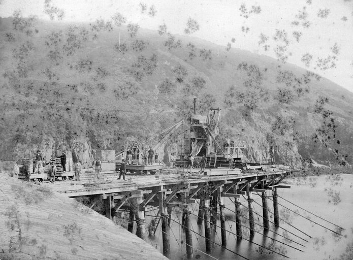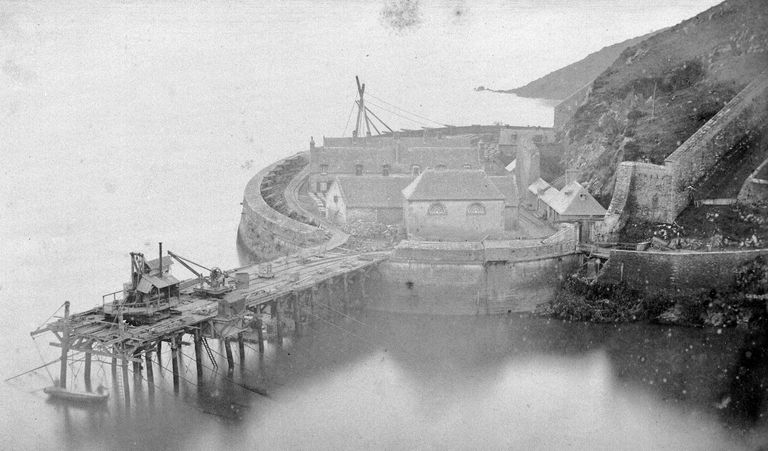 Vue du fort du Mengant en 1877 : détail du chantier de construction du môle d'accostage